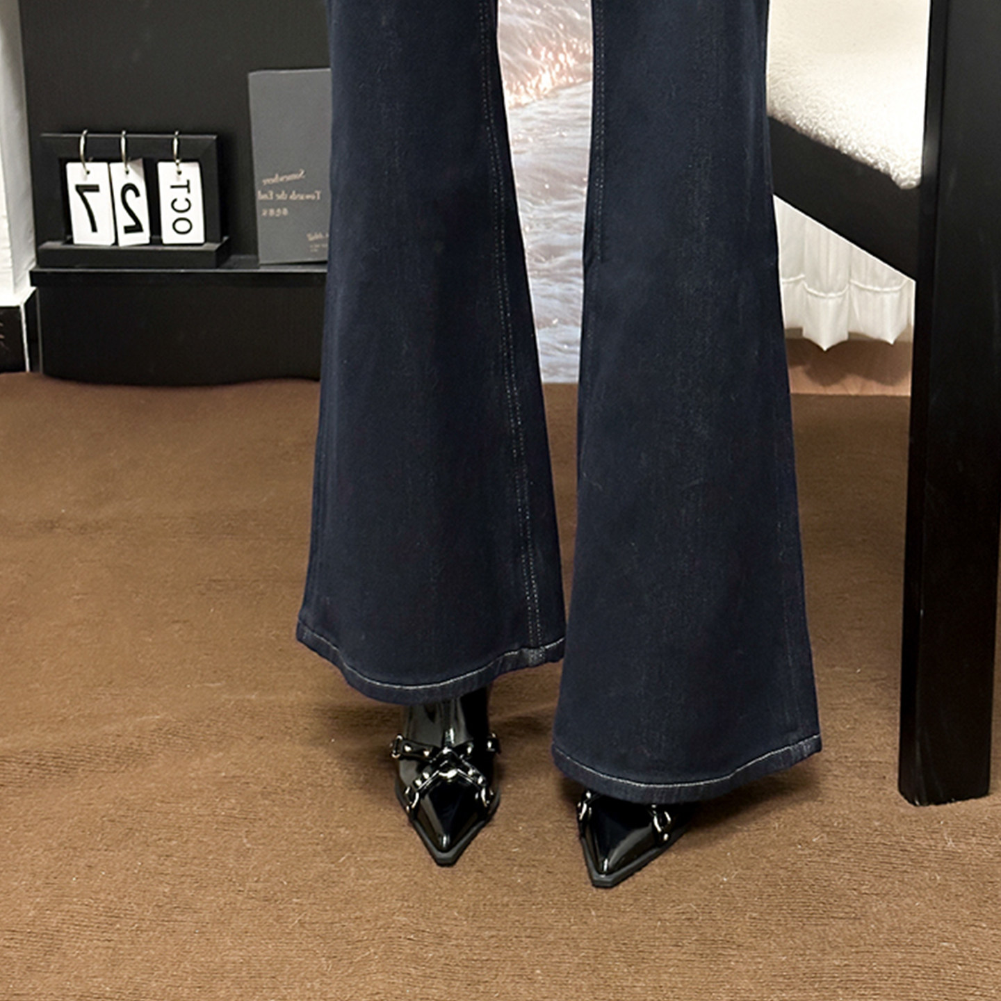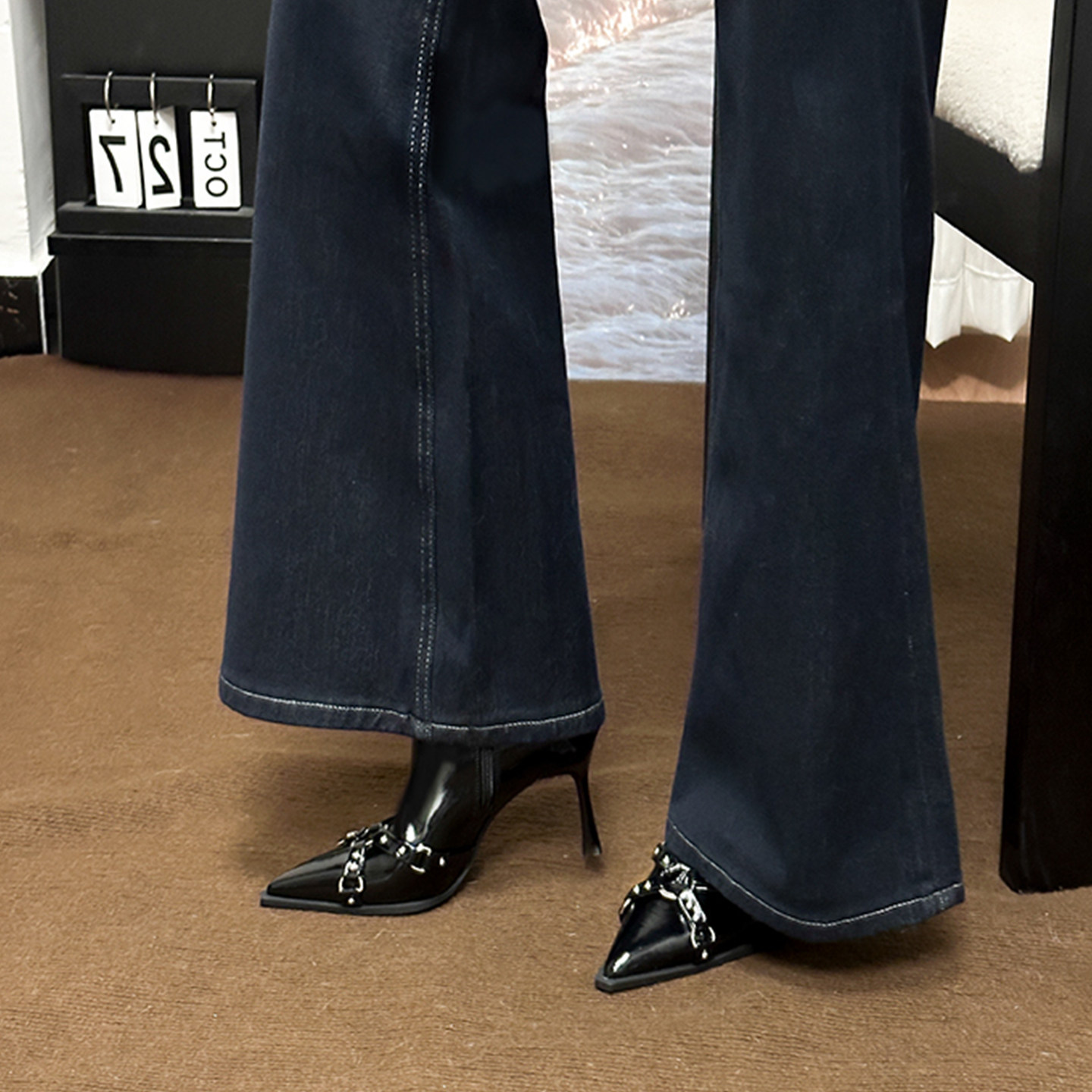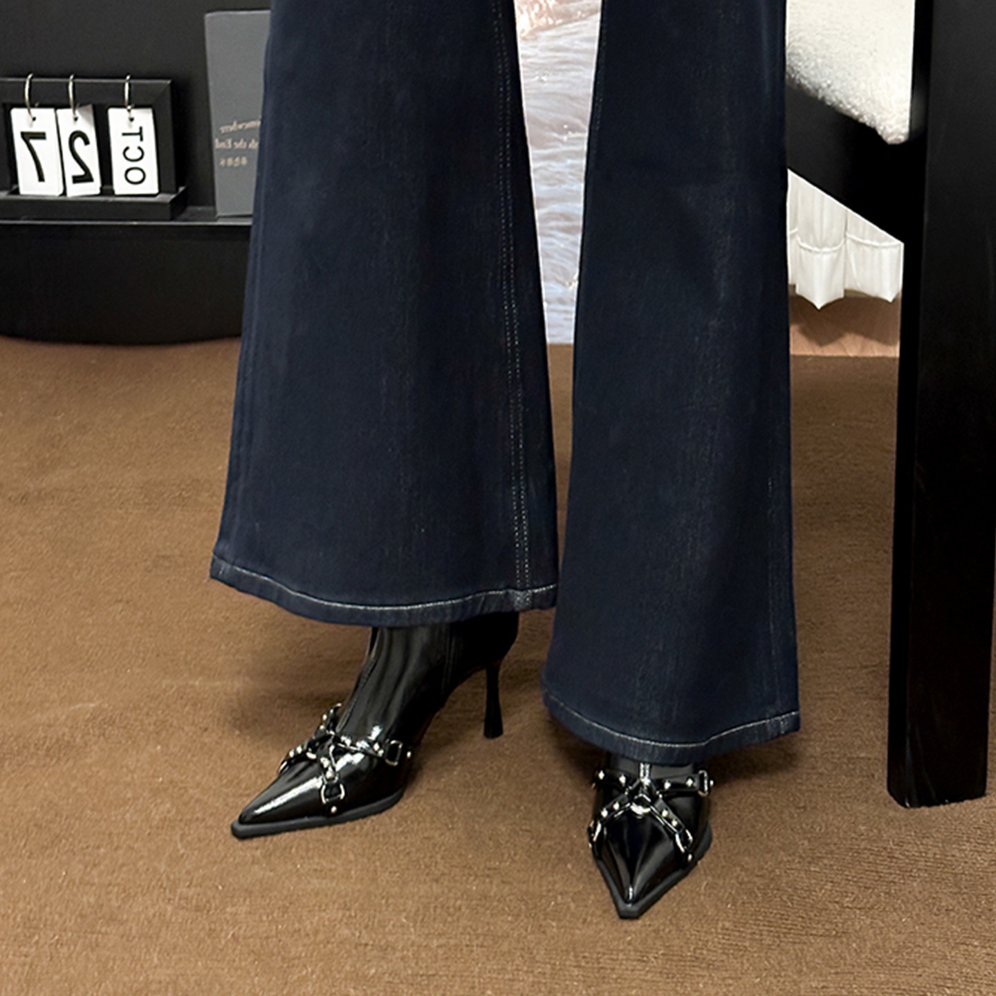 黑色铆钉尖头高跟短靴法式瘦瘦靴