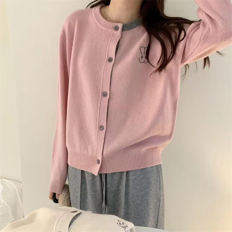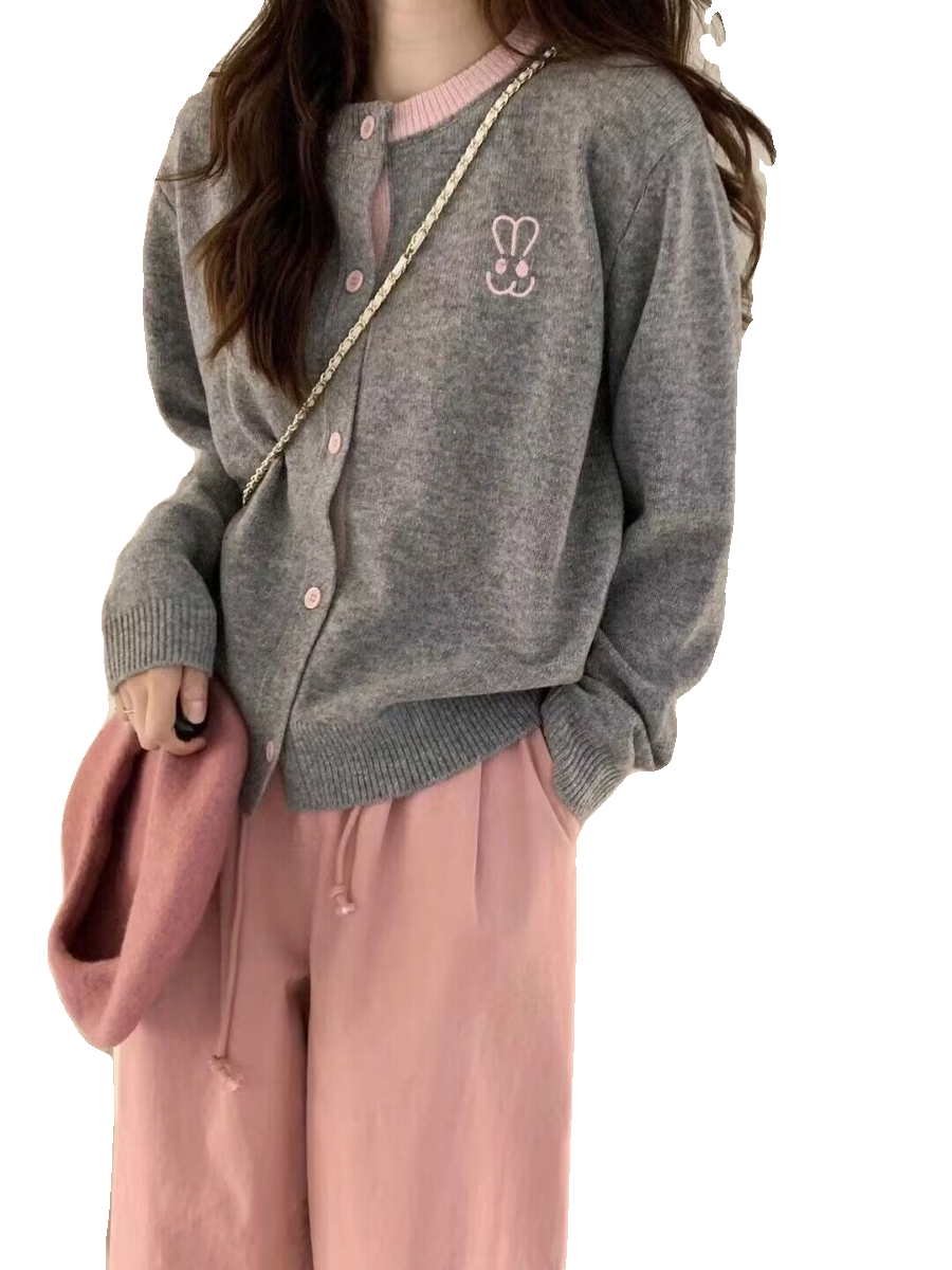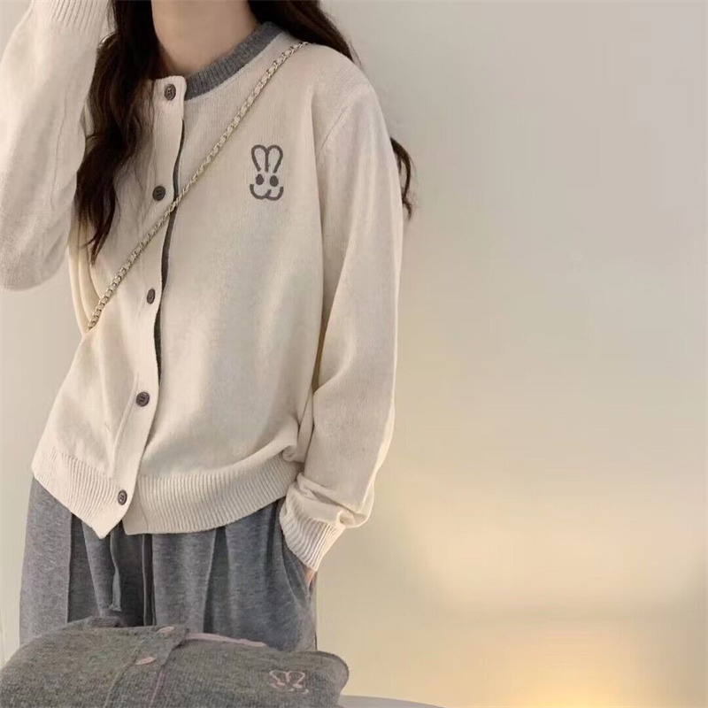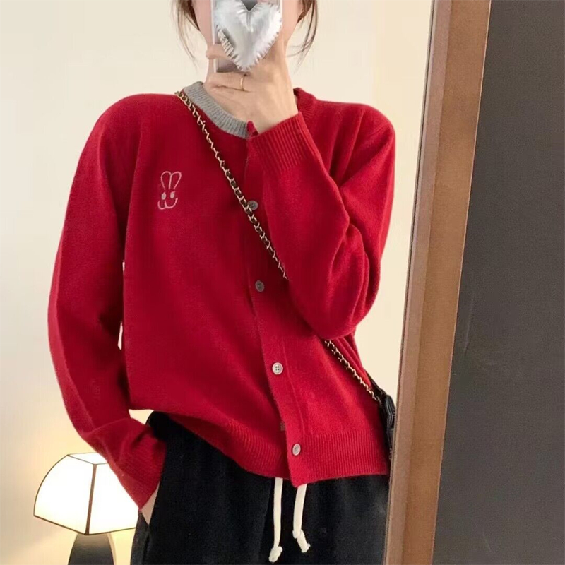 兔子刺绣羊绒开衫女圆领毛衣外套拼色100%纯羊毛针织开衫减龄外搭