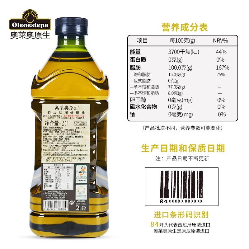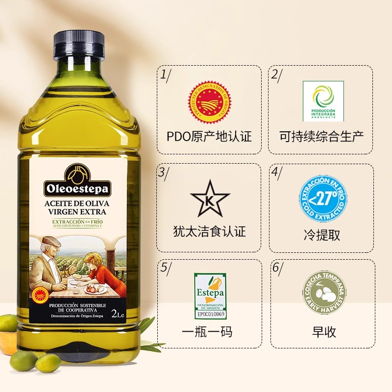 【原装进口】奥莱奥原生PDO特级初榨橄榄油2L庄园西班牙食用油桶