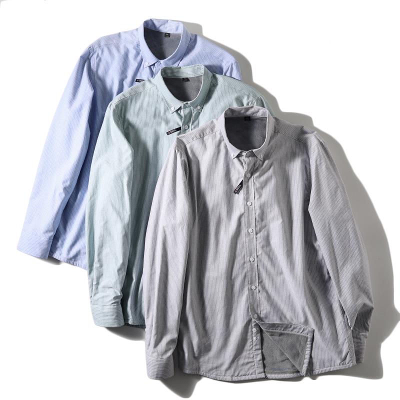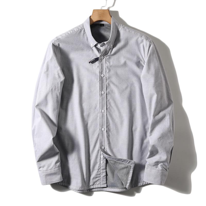 水洗牛津纺纯棉冬季男士加绒加厚防风保暖竖条纹翻领休闲长袖衬衫