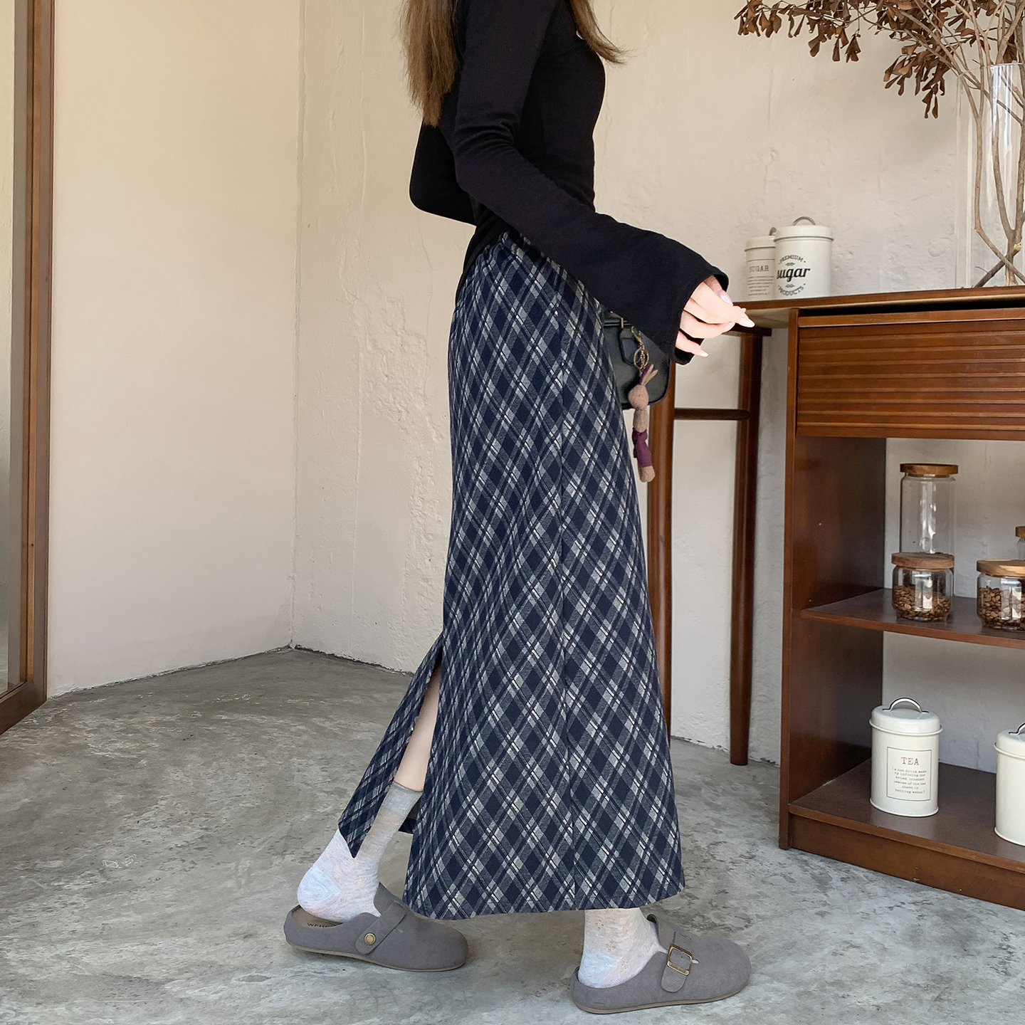 复古格纹半身裙女2025秋季小众美拉德垂感直筒裙中长款开叉包臀裙