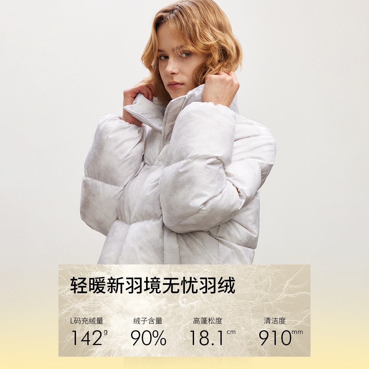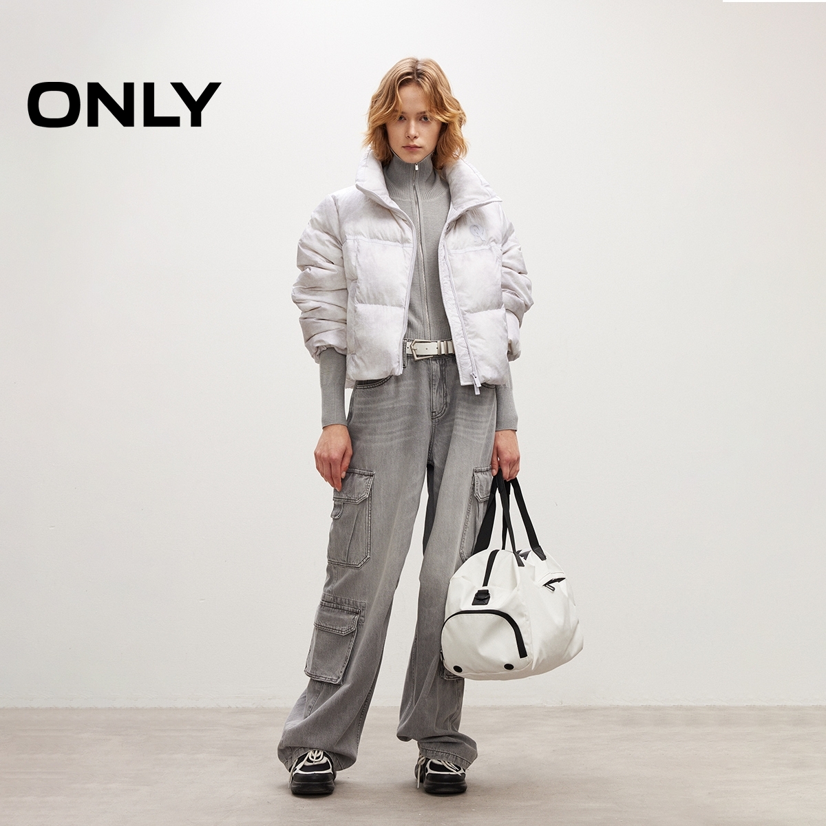 ONLY2025冬季新款宽松短款轻薄斑驳拉链印花抽绳白鸭绒羽绒服女
