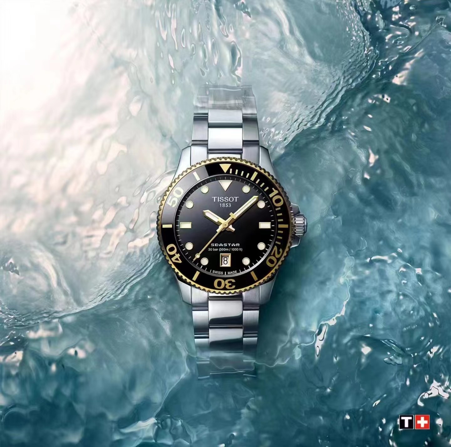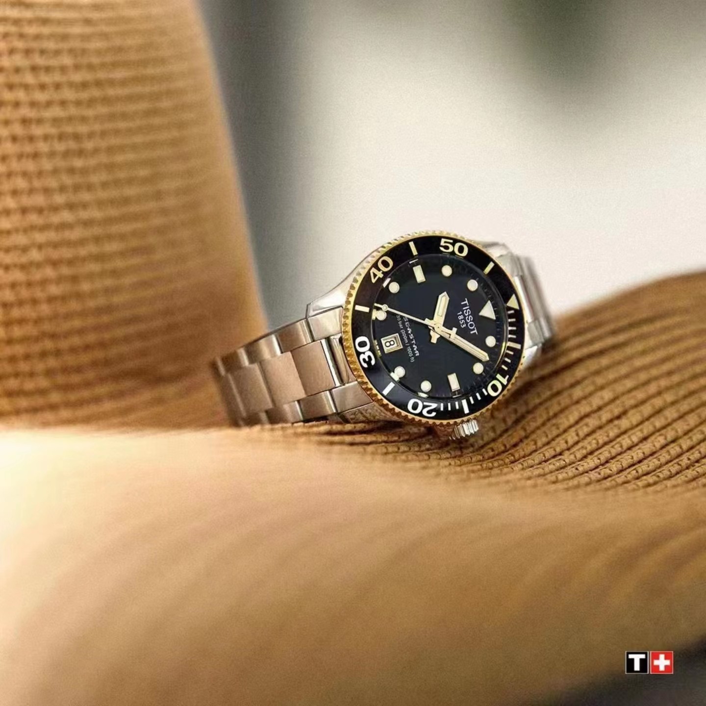 Tissot 天手表女海星1000系列黑金配色钢带石英潜水女表