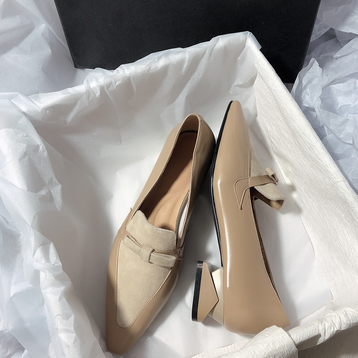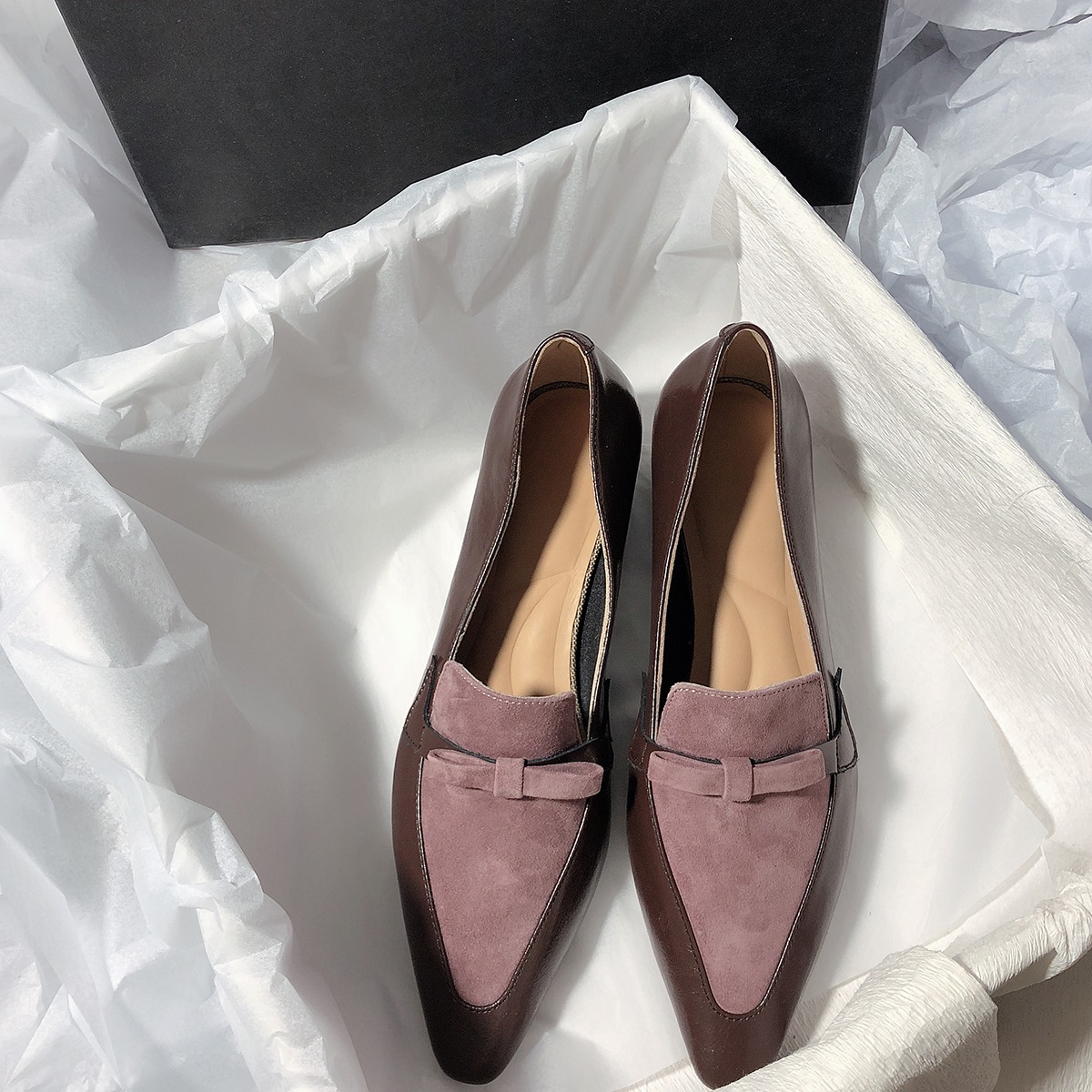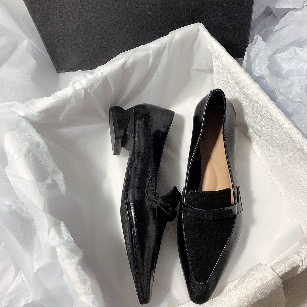 春夏蝴蝶结英伦风小皮鞋法式拼接粗跟尖头单鞋中跟优雅真皮乐福鞋
