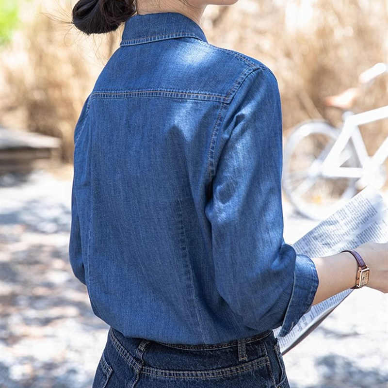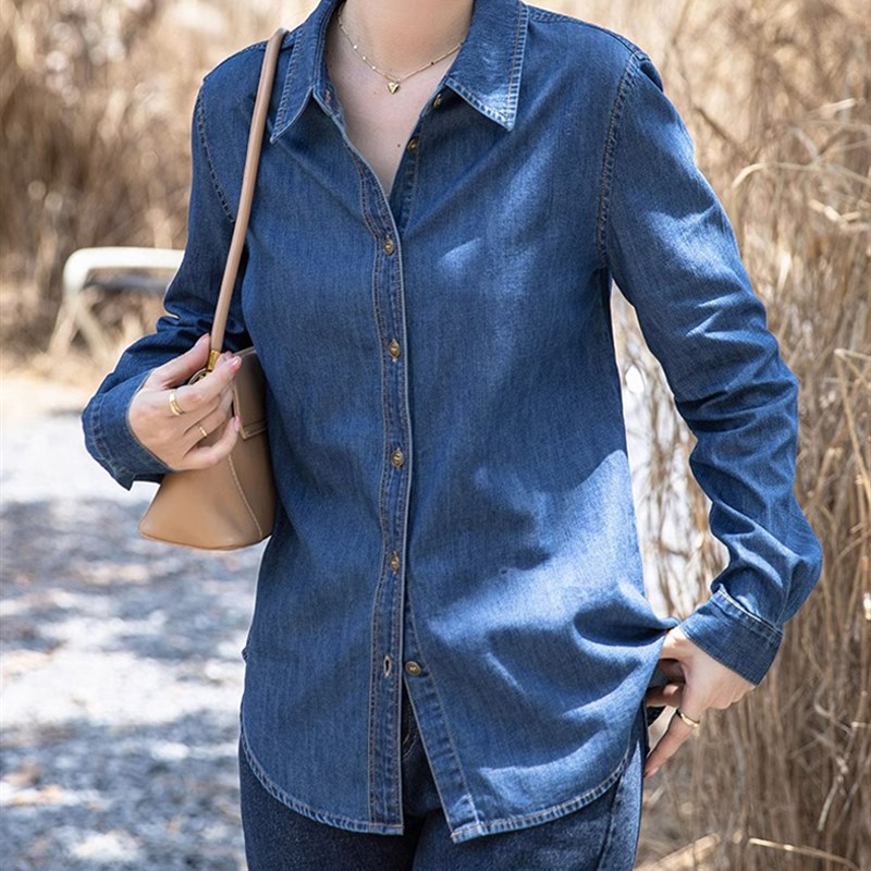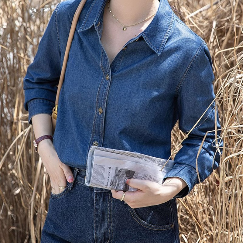 蓝色牛仔衬衫女2024春季新款港风复古叠穿衬衣小个子休闲长袖上衣
