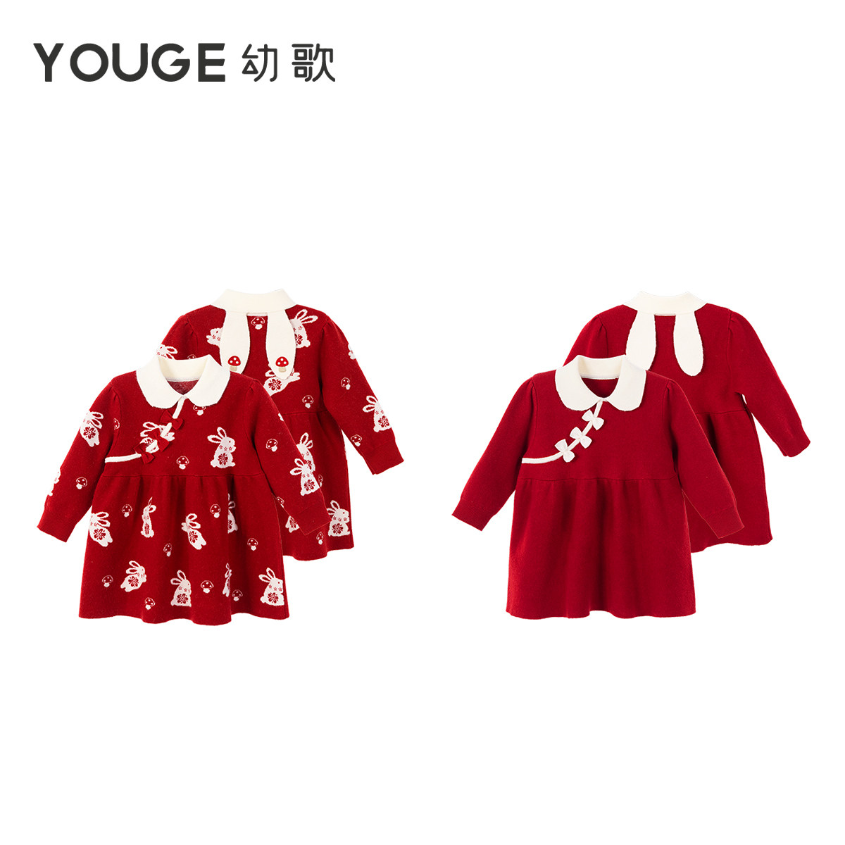 YOUGE幼歌 婴幼儿新中式红色年服甜美乖巧小翻领国风毛衣连衣裙潮