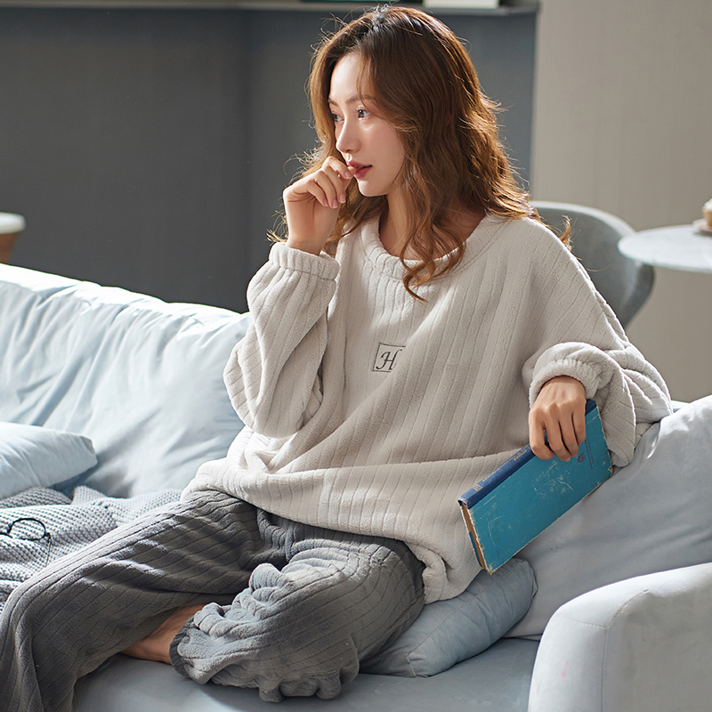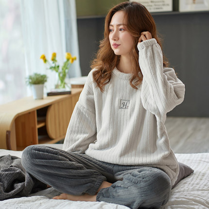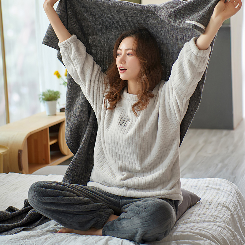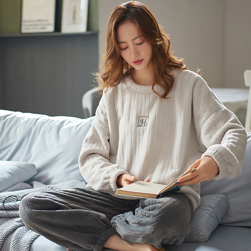 睡衣女款秋冬季保暖加厚加绒休闲珊瑚绒法兰绒长袖套装冬天家居服