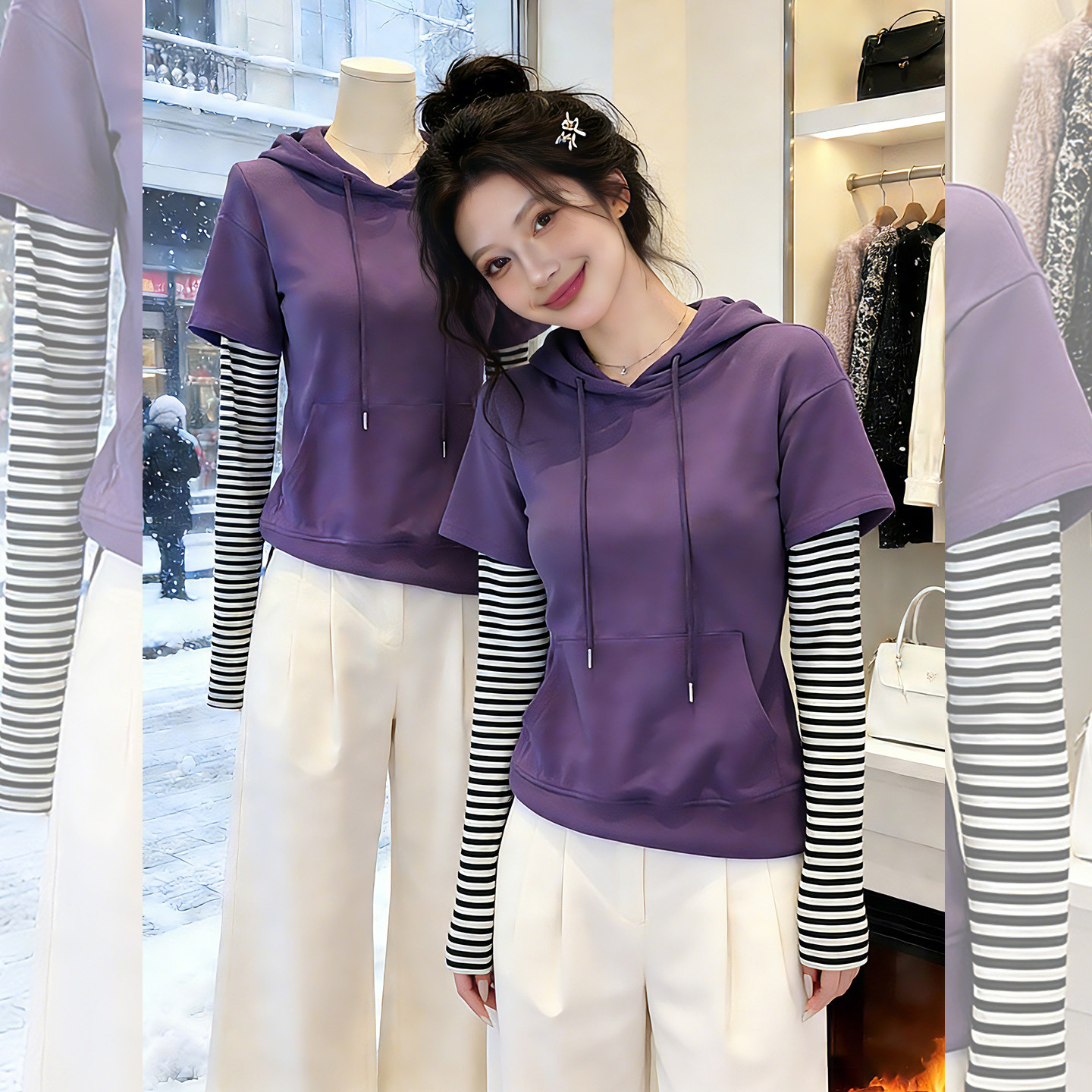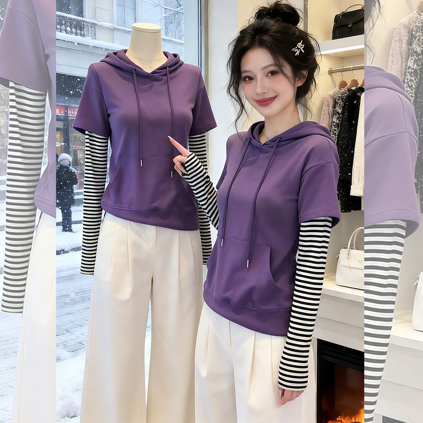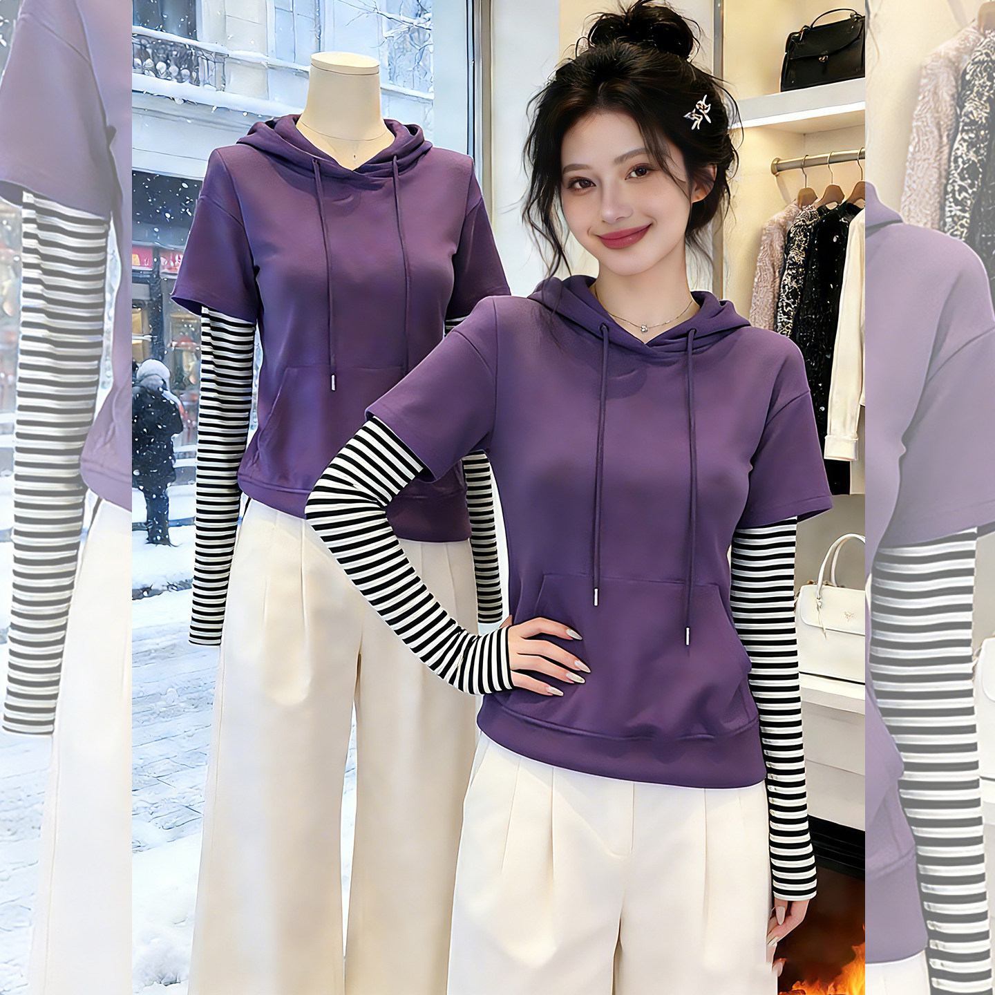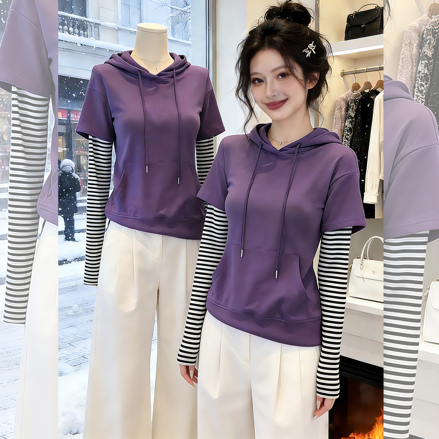 柔纹紫调~紫色连帽假两件上衣女