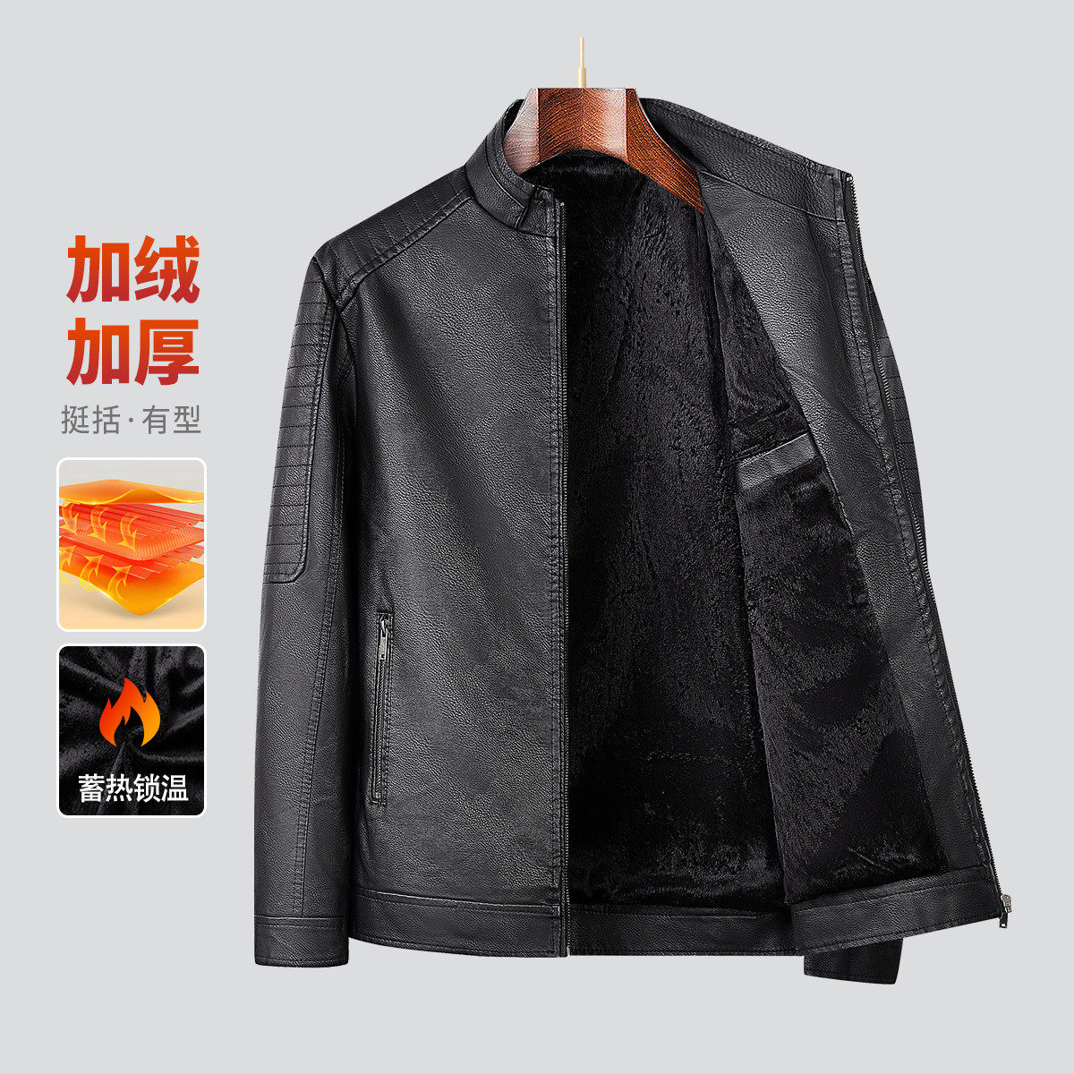 杉杉冬加绒加厚高级感皮衣口袋拉链袖口立领短款PU皮夹克男士外套