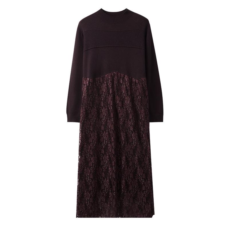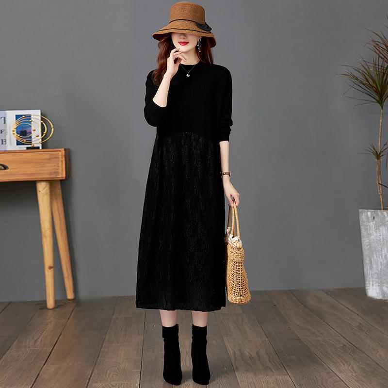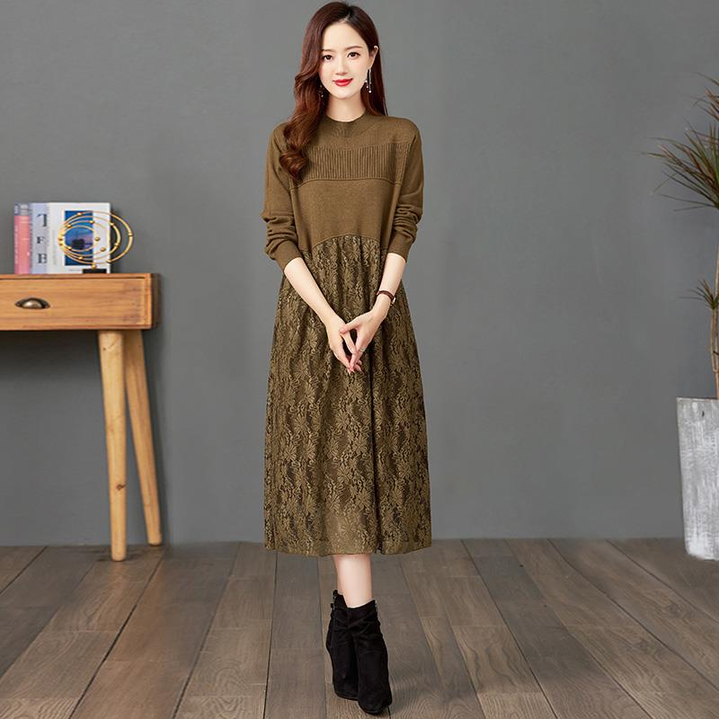 春秋女蕾丝中长款羊毛裙时尚洋气针织毛衣连衣裙配大衣打底衫内搭