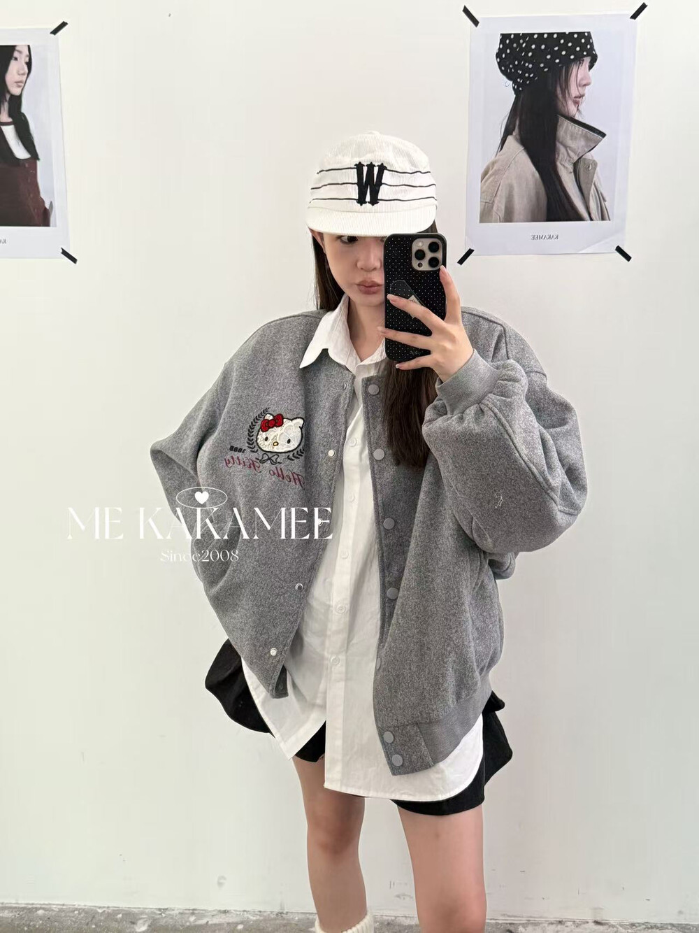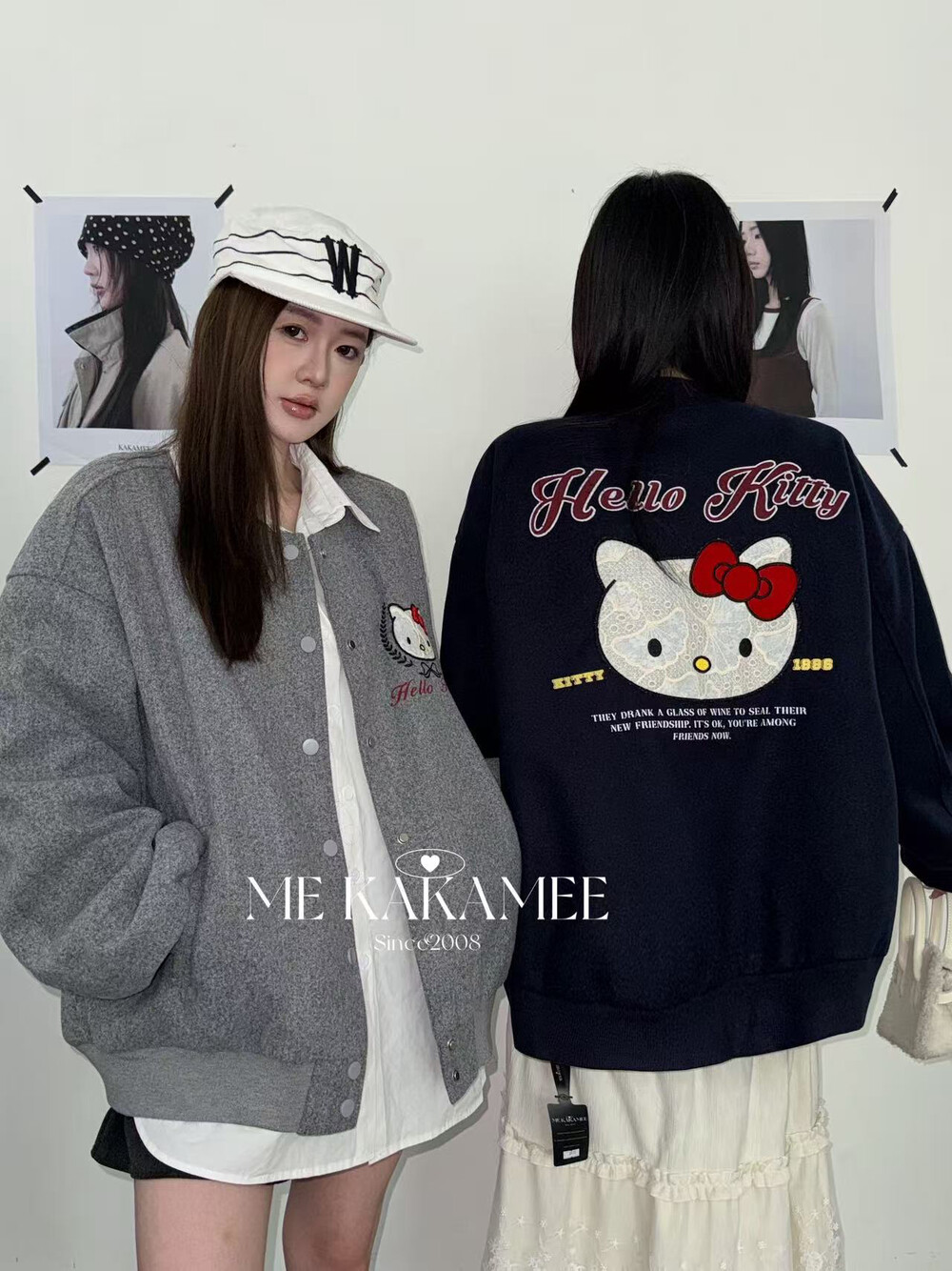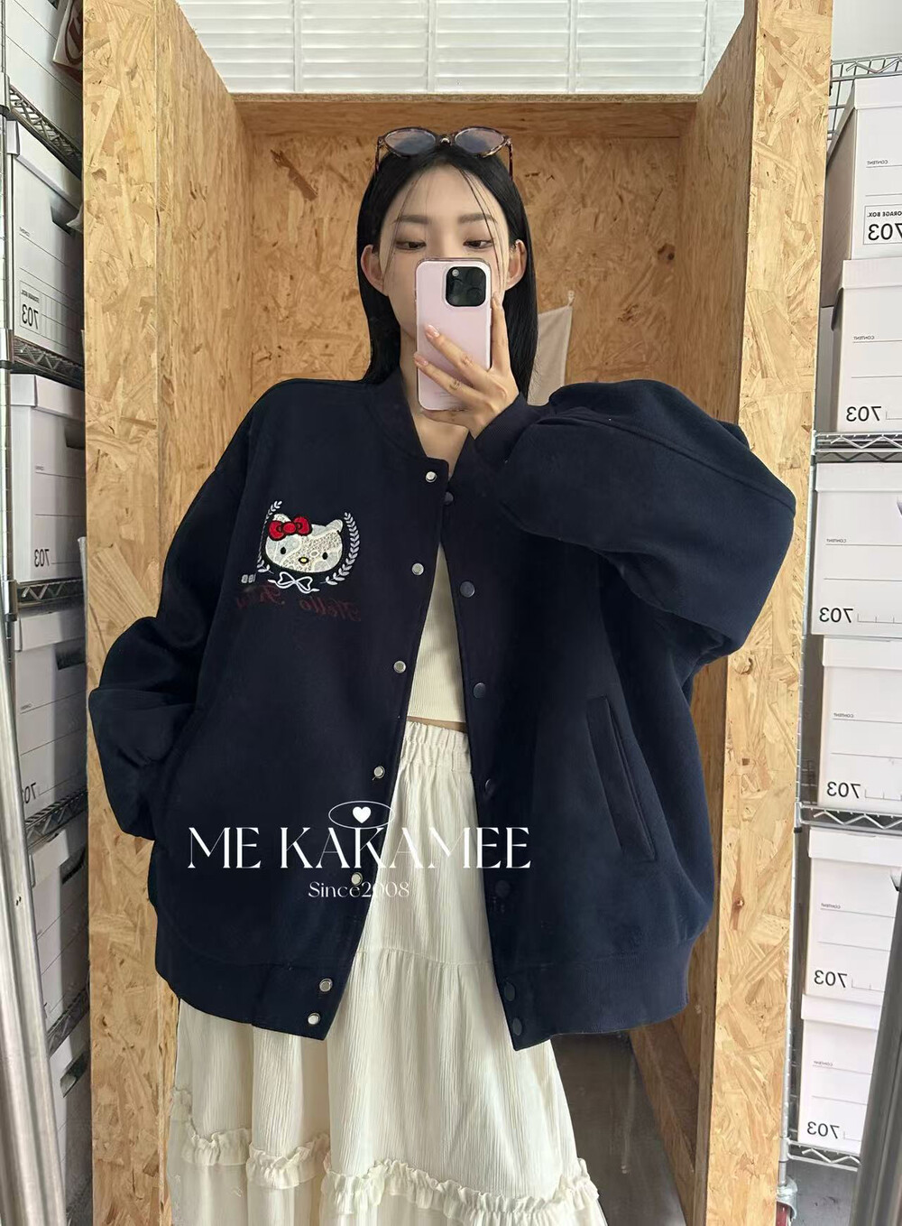 ME KAKAMEE冬新品蕾丝刺绣KT猫夹棉保暖夹克棒球服外套女8975