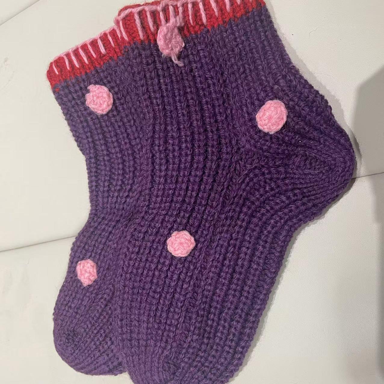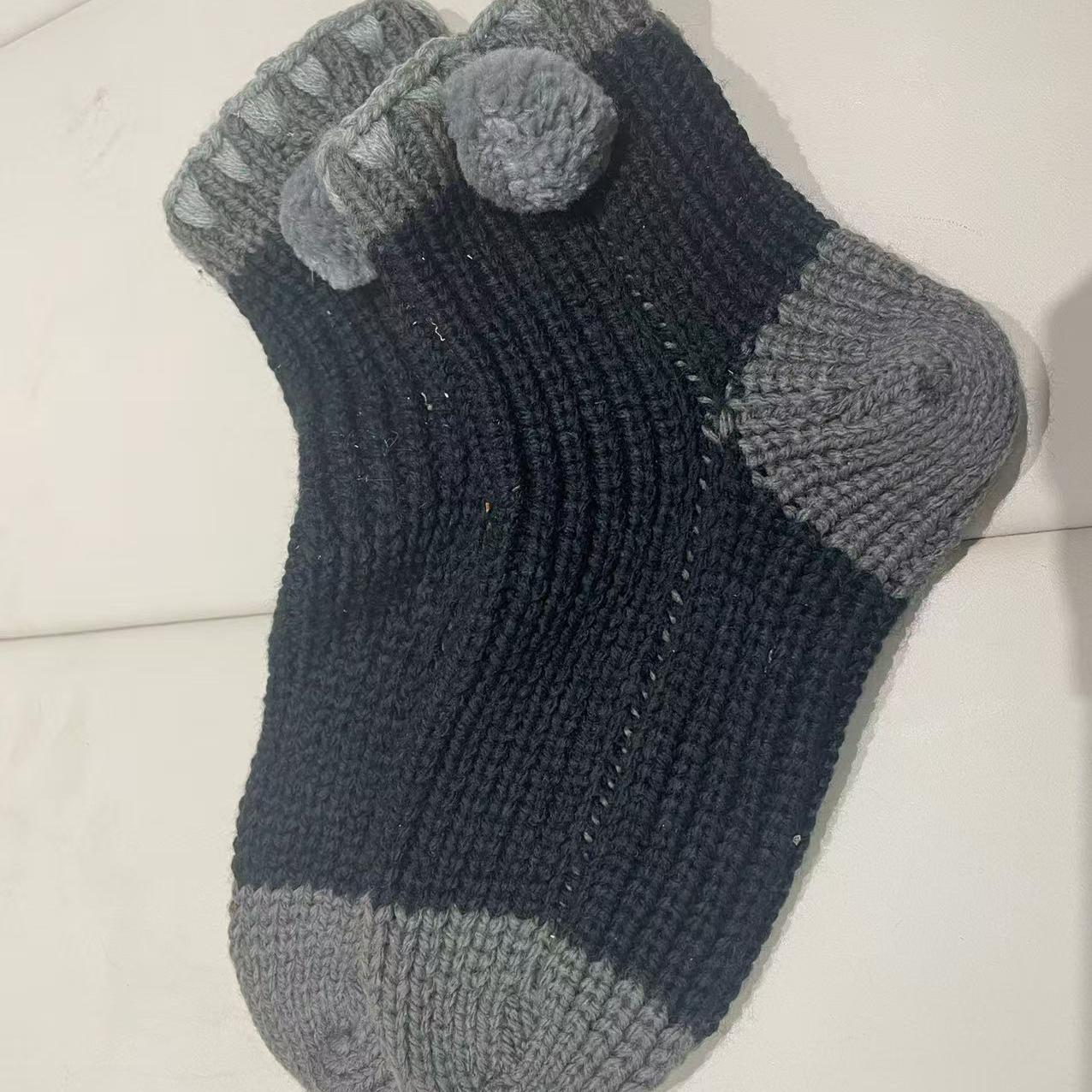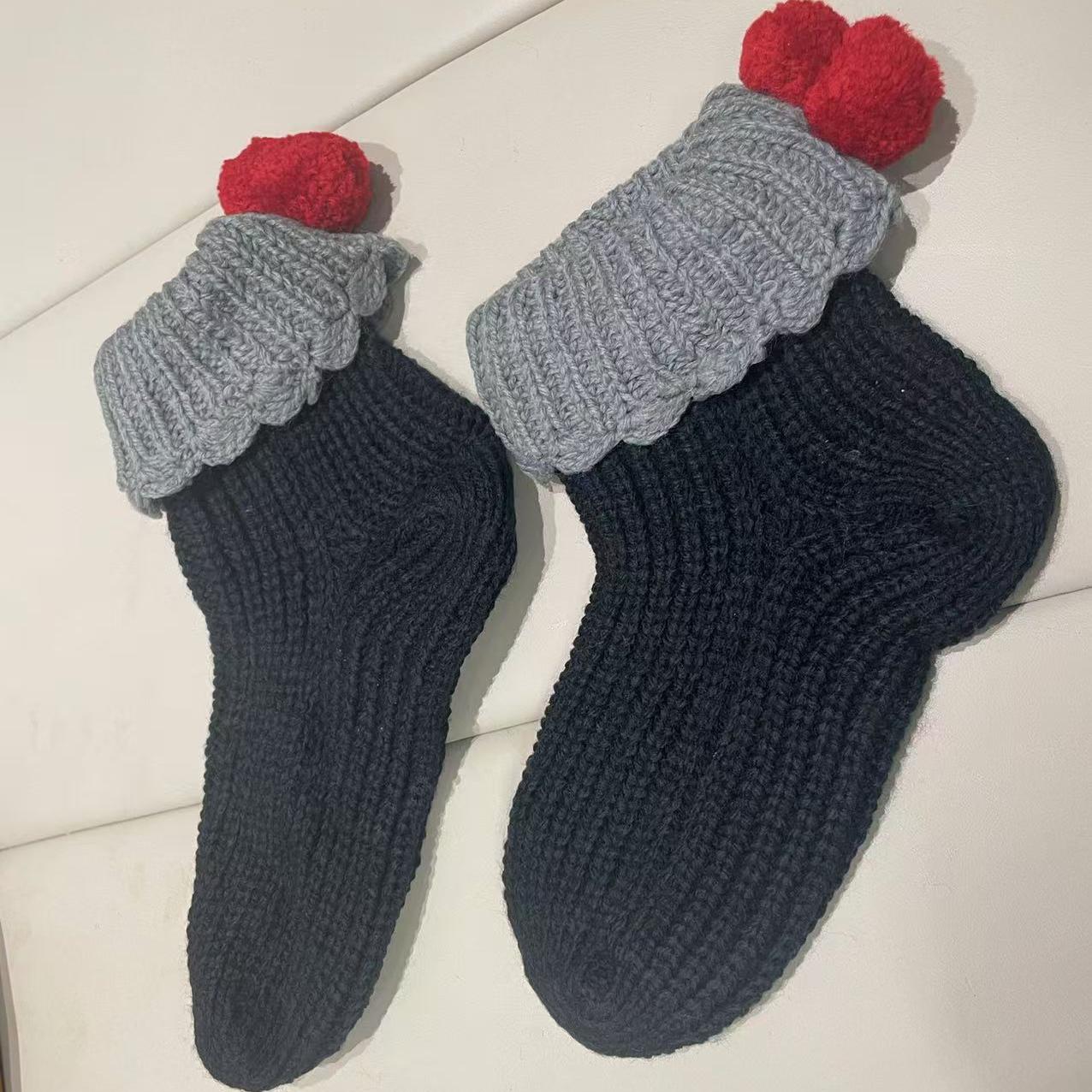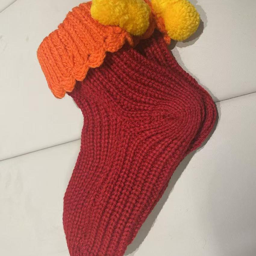 秋冬新款粗毛线袜小众立体球球拼接撞色个性潮流百搭外贸中筒袜