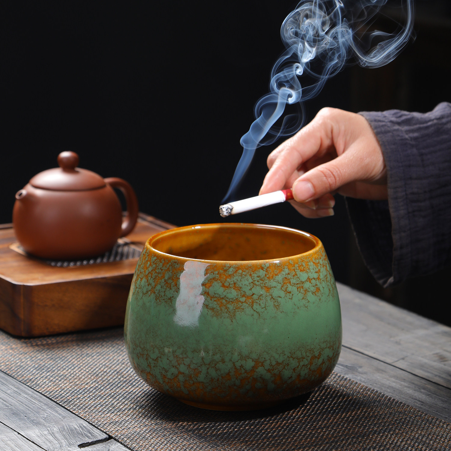 窑变绿釉大容量茶洗茶渣缸带盖过滤茶台禅意杯洗陶瓷水盂茶杯盆