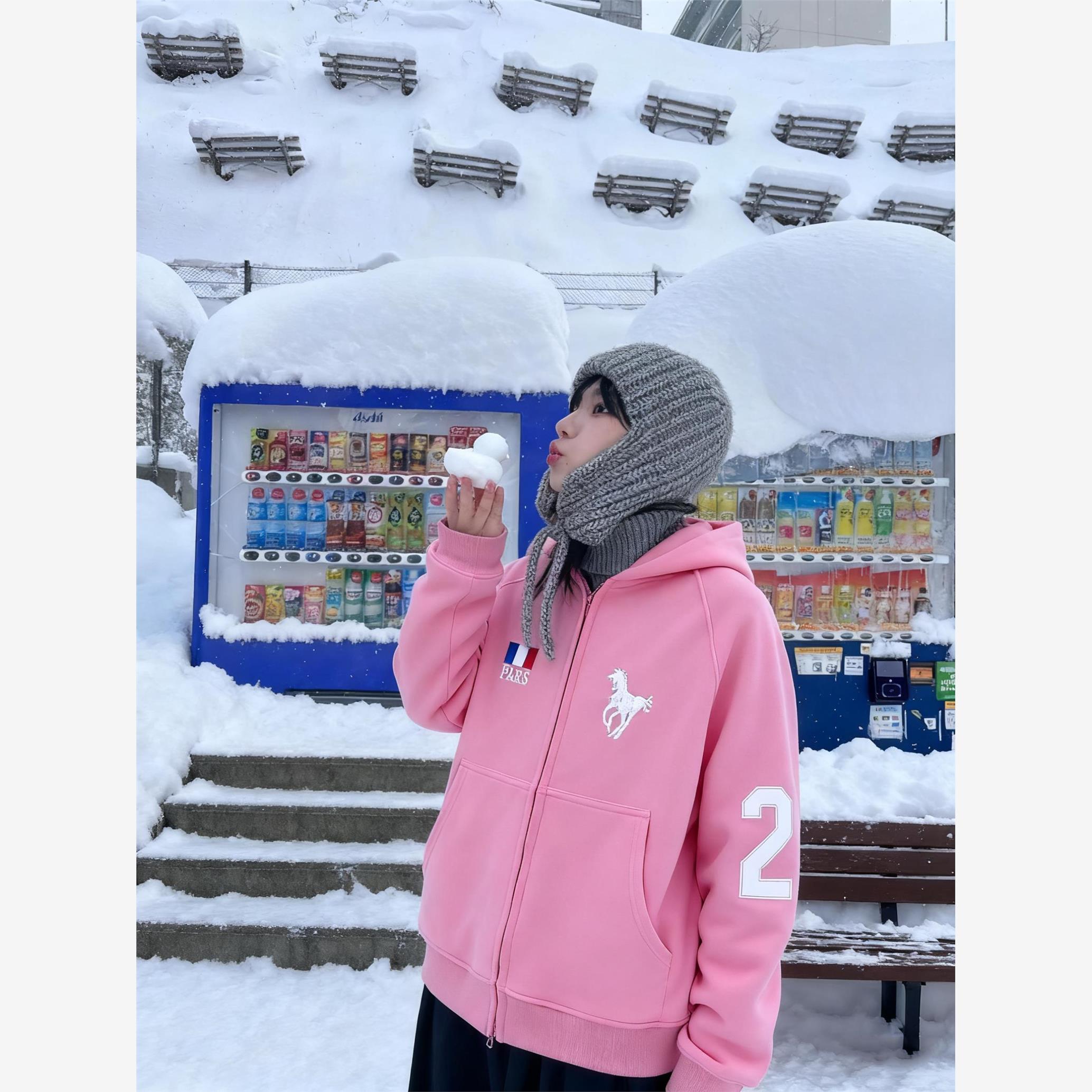 欧洲aespa柳智敏同款粉色开衫连帽卫衣外套女2025秋季情侣装拉链