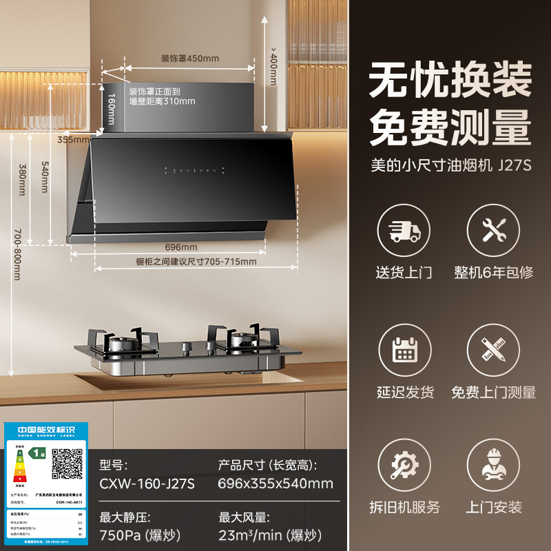 美的J27S抽油烟机家用厨房大吸力侧吸小尺寸换装版出租房免改造