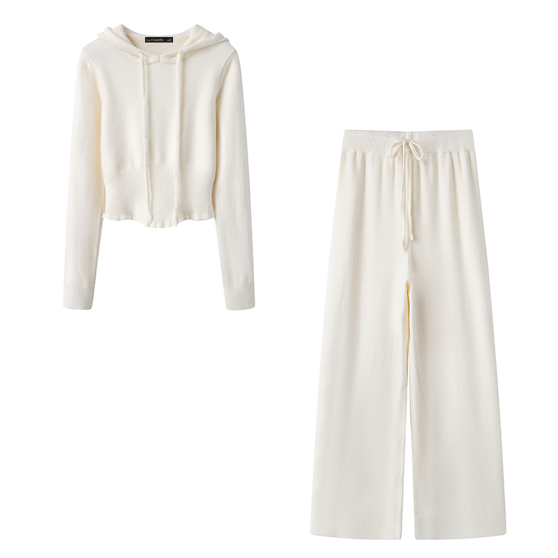 拉夏贝尔/La Chapelle秋冬连帽针织衫毛衣高腰阔腿长裤两件套装女