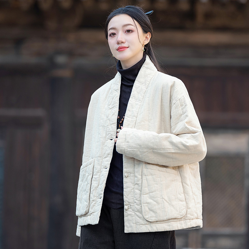 新中式夹棉女冬2025新款棉麻复古V领斜襟盘扣禅茶服短款加厚棉衣