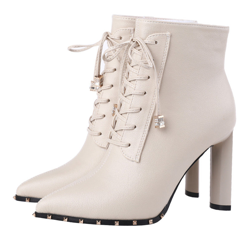 铆钉黑色高跟短靴2024系带尖头