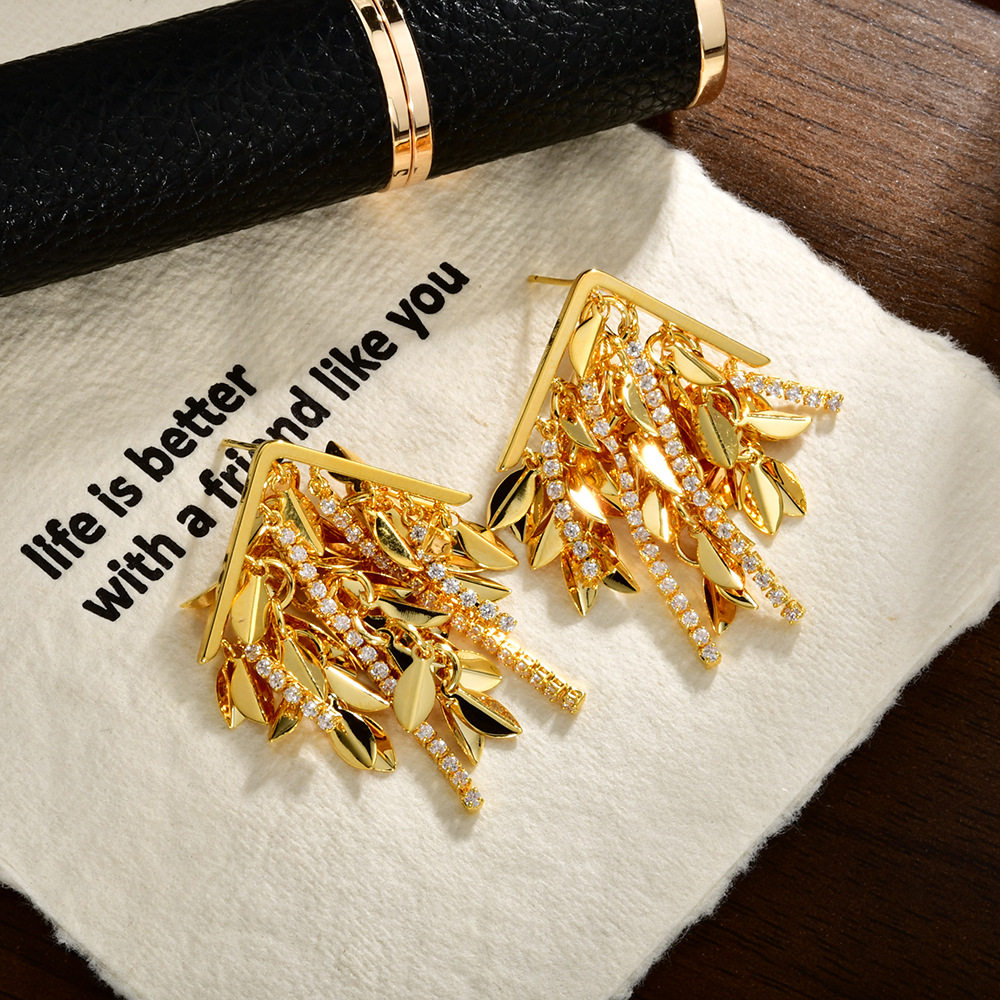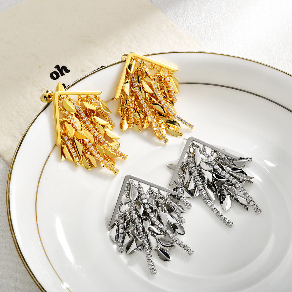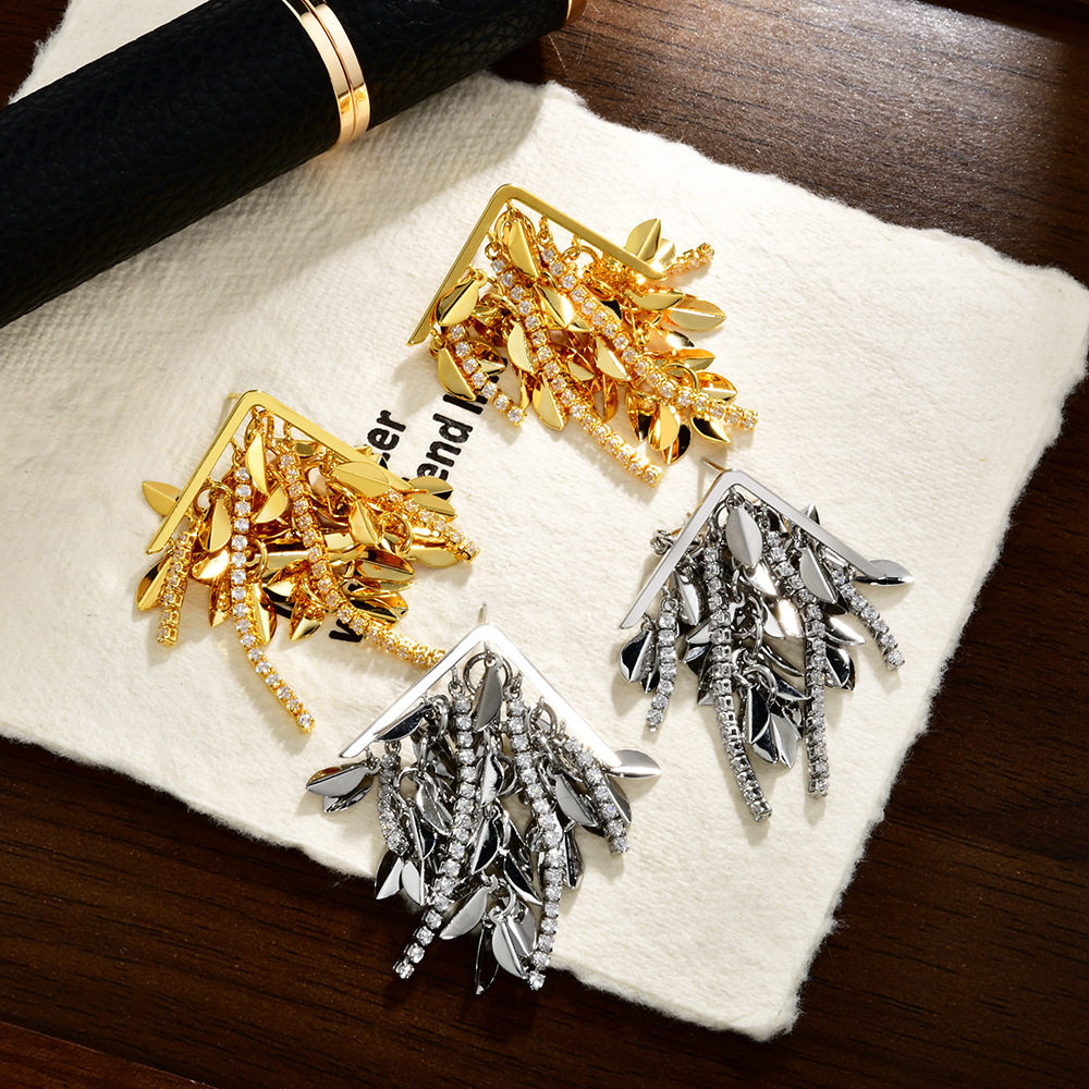 轻奢高级感麦穗树叶流苏耳钉ins风时尚气质镶锆耳环个性创意耳饰
