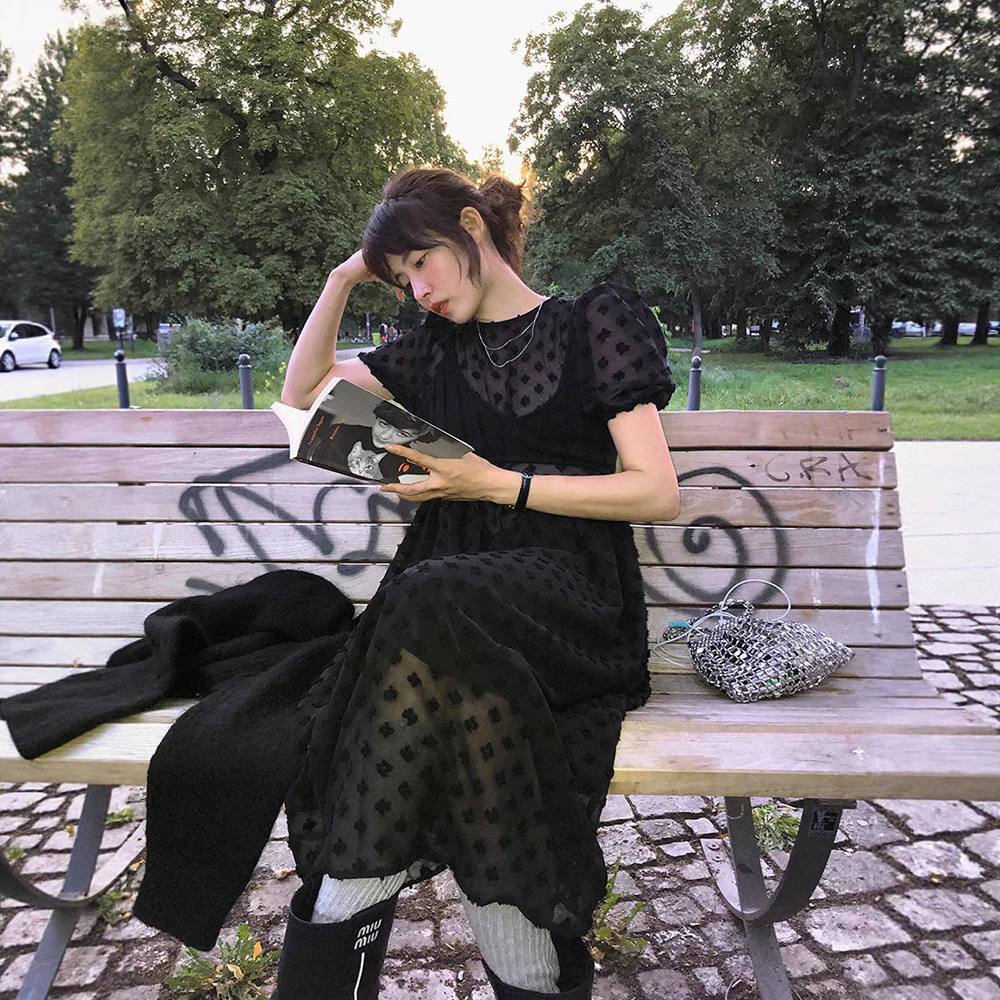 现货 25夏款纯色微透圆领收腰叠穿小清新文艺短袖A字长裙连衣裙女