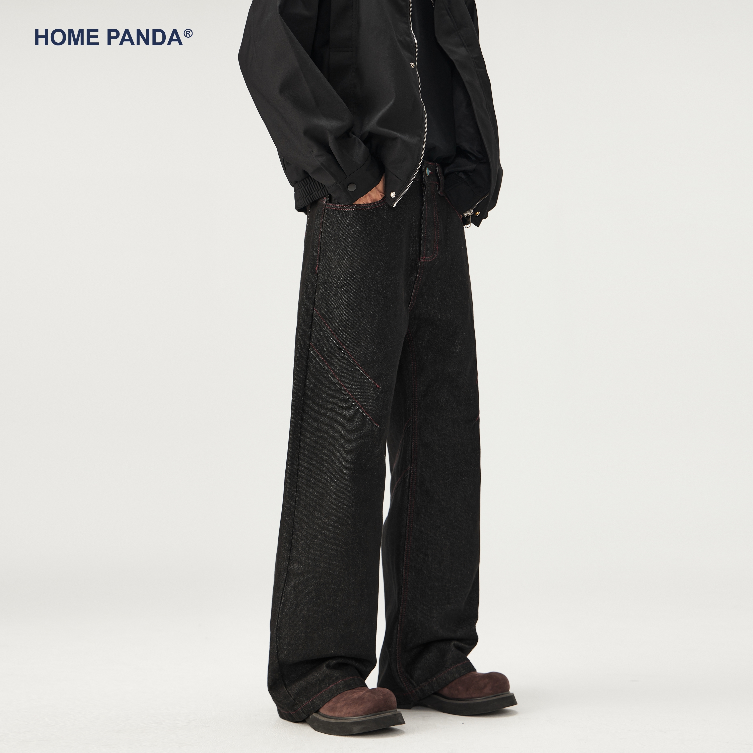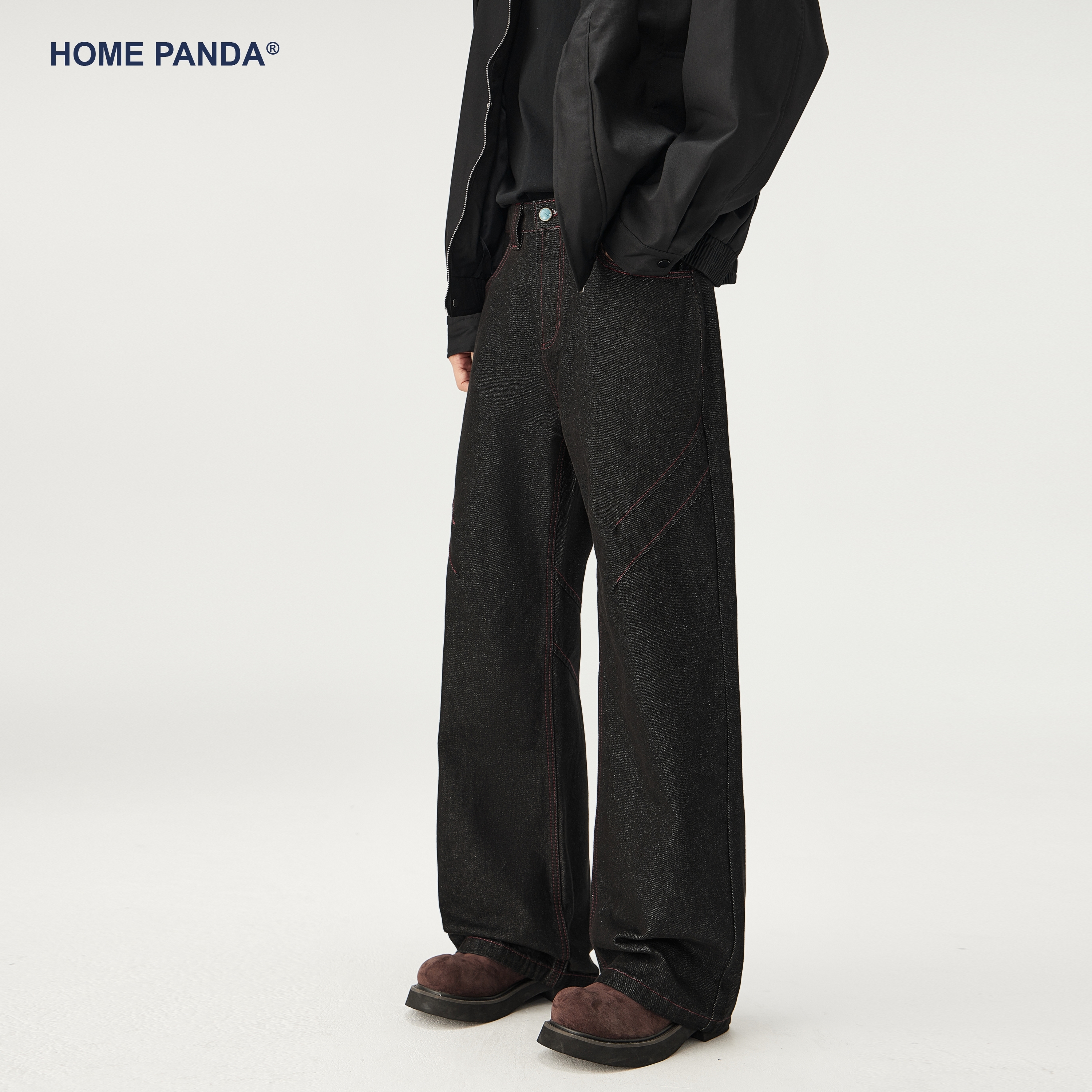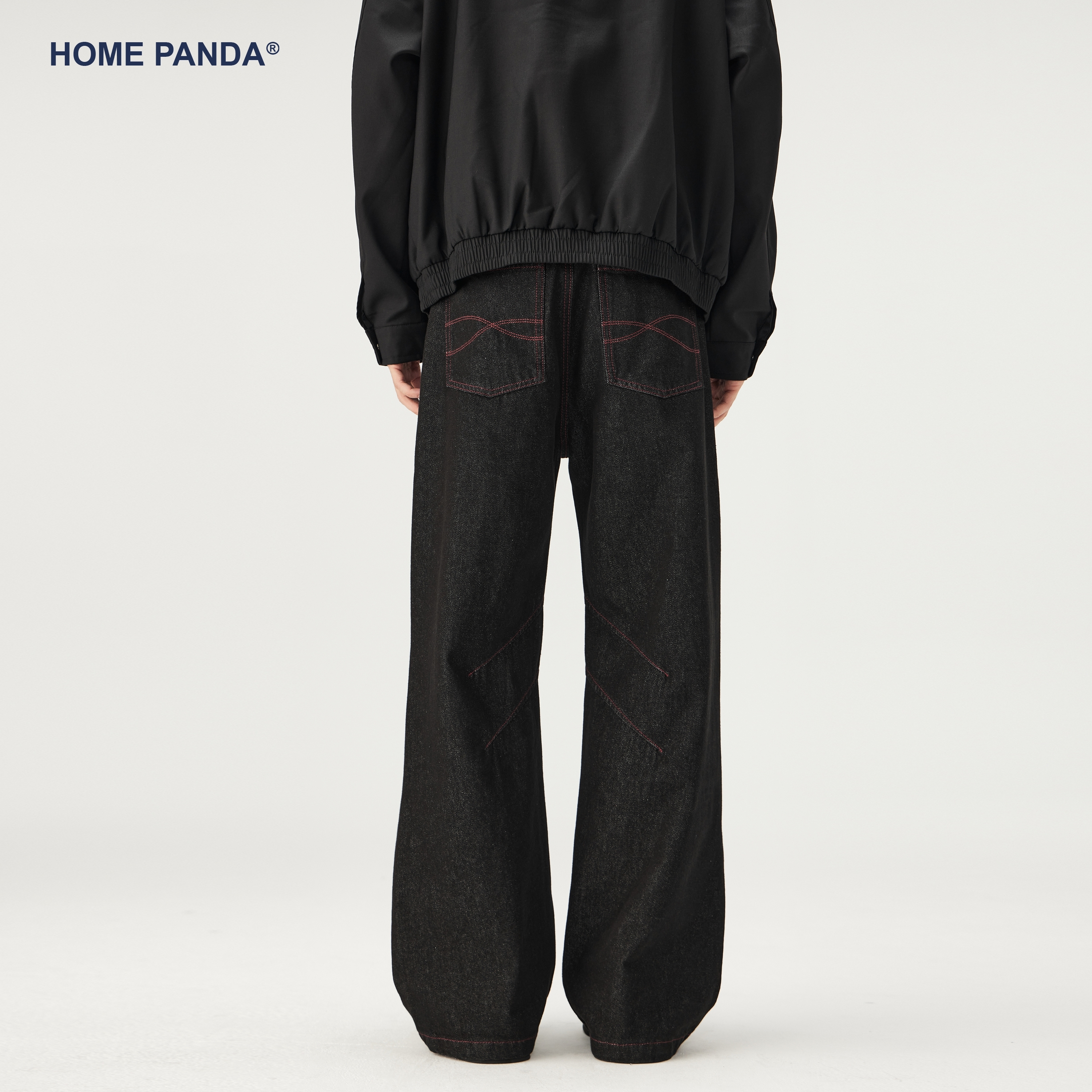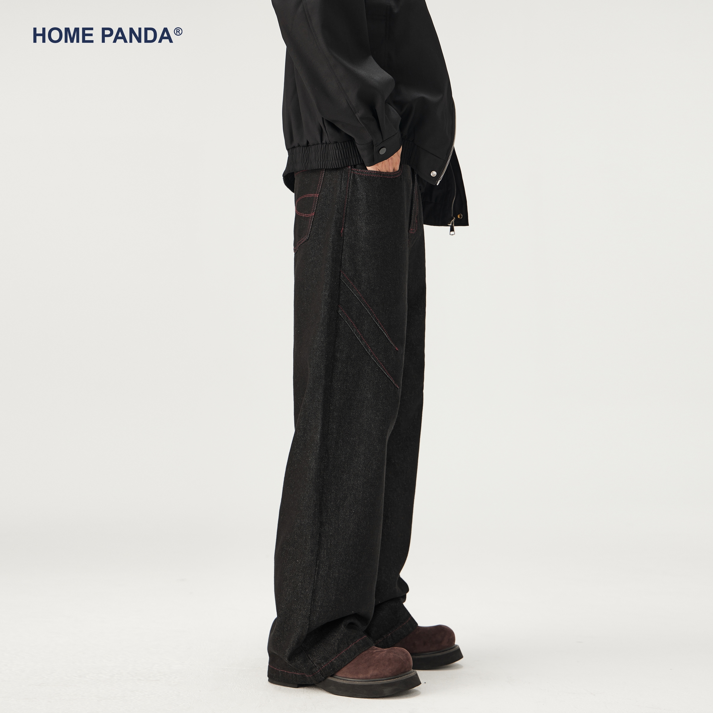 HomePanda原色直筒弯刀牛仔裤男秋季美式复古红线廓形宽松阔腿裤