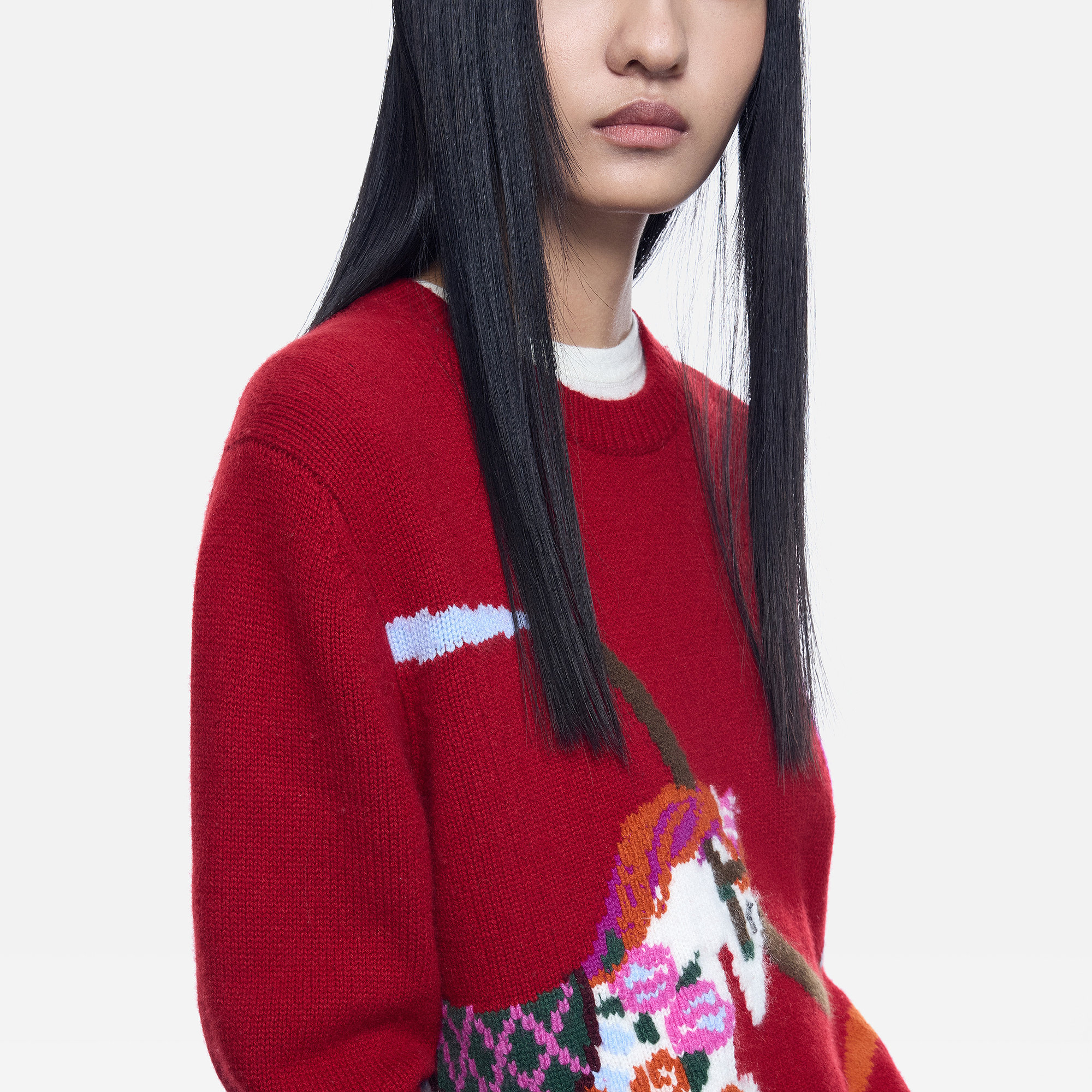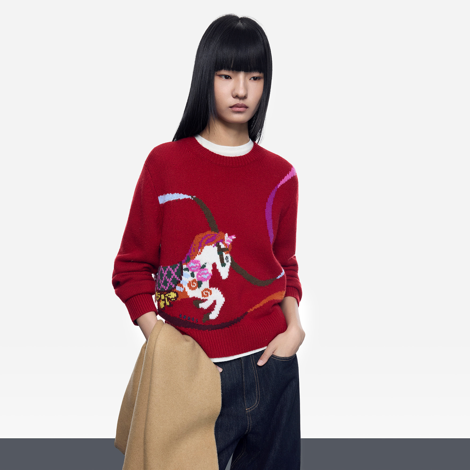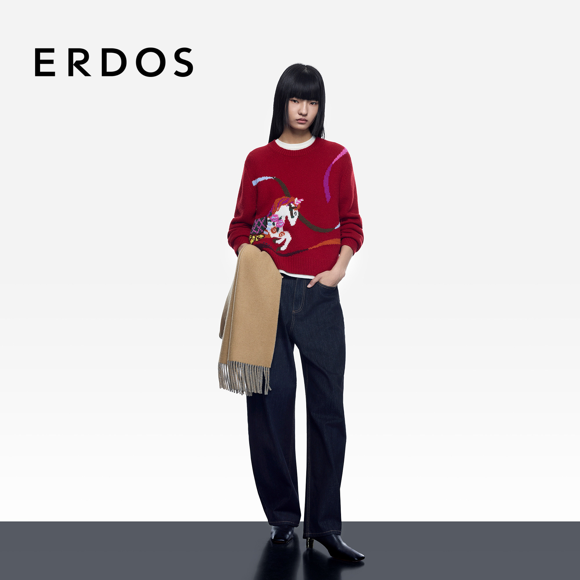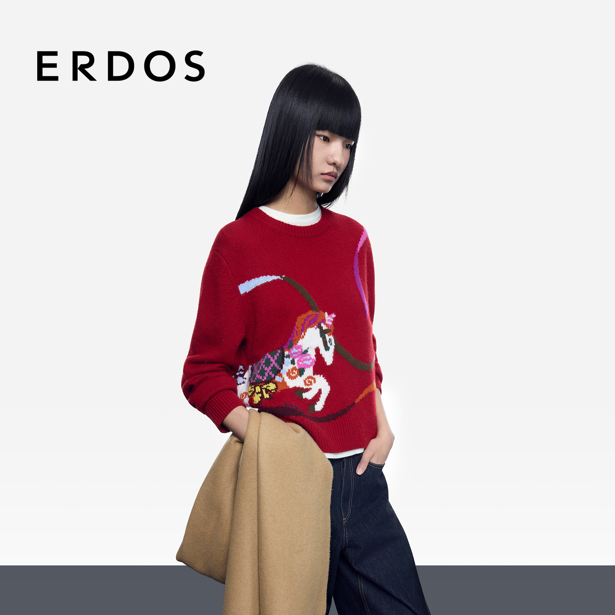 ERDOS 提花羊绒衫25年秋冬新品圆领生肖红色女针织衫新岁礼物系列