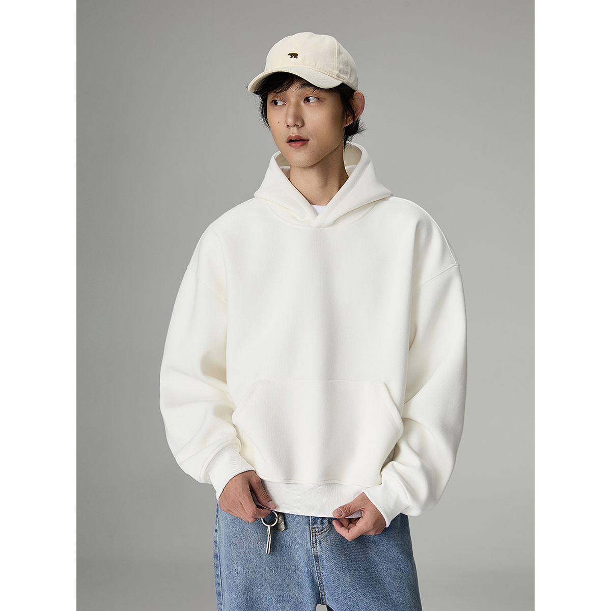 BOLM春秋季美式重磅cleanfit纯色连帽卫衣男白色短款宽松显高帽衫