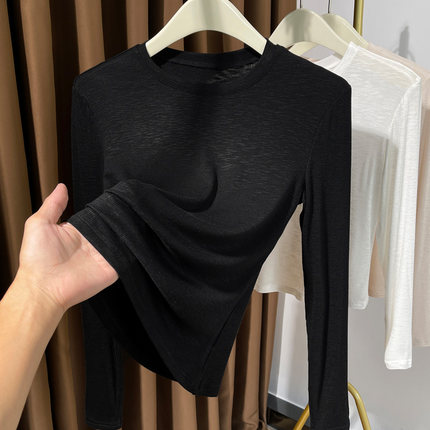 黑色小圆领针织内搭打底衫女薄款高级感竹节棉T恤女长袖洋气小衫