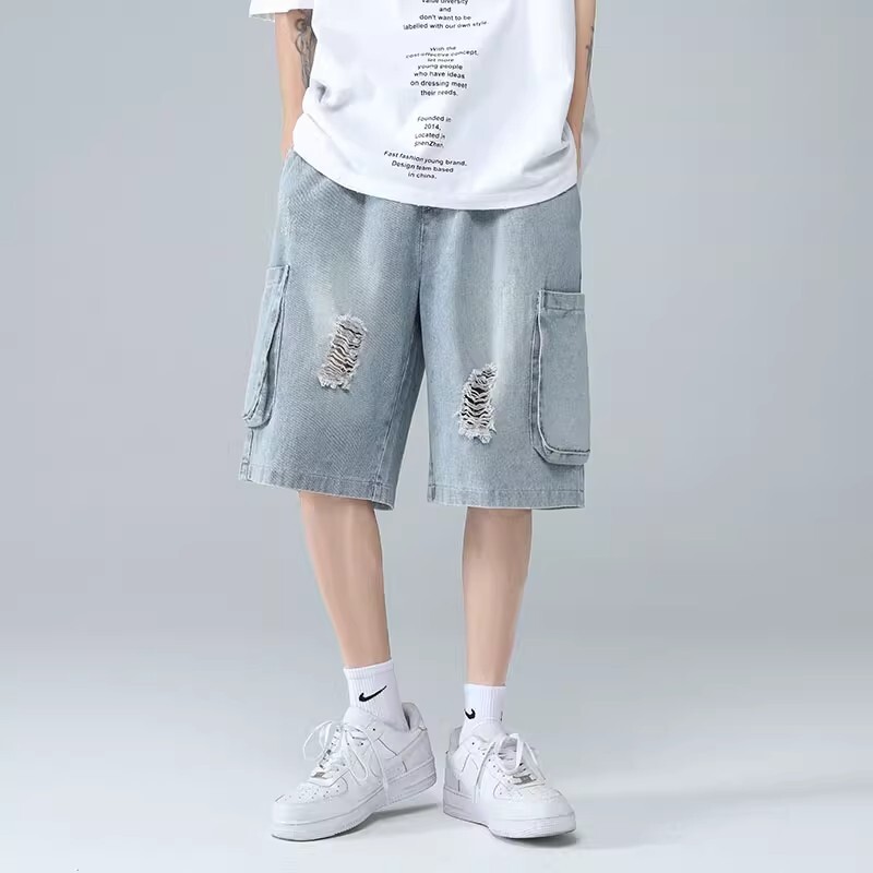 破洞牛仔短裤男款夏季薄款潮牌工装裤子宽松五分裤美式高街大裤衩