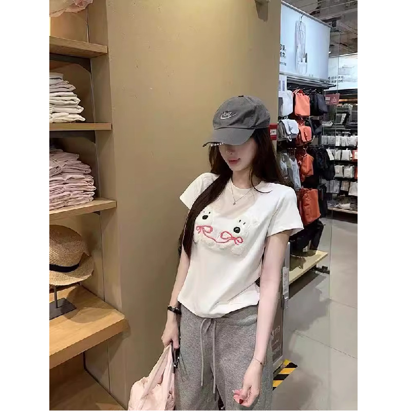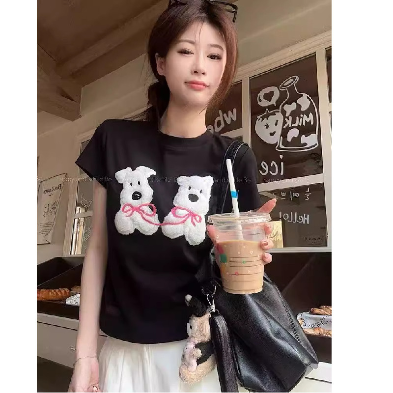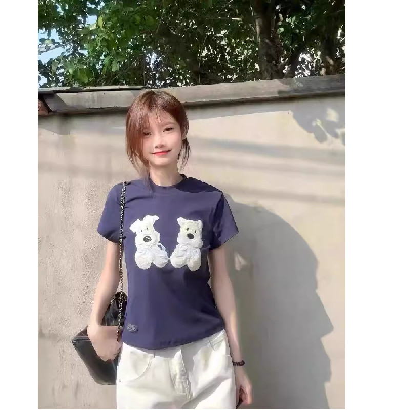 设计感小熊植绒圆领短袖T恤女夏季新款正肩显瘦休闲百搭纯棉上衣