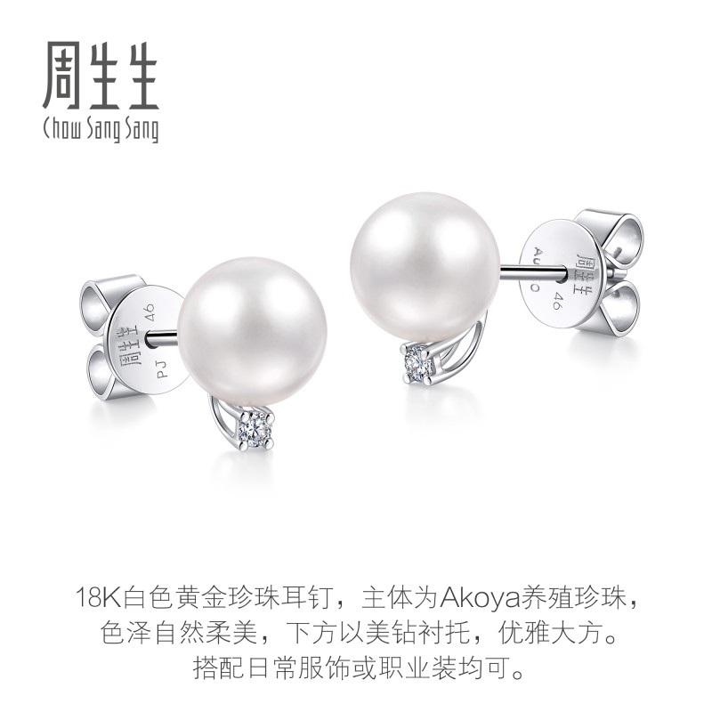 周生生18K白色黄金Akoya珍珠钻石耳钉45588E定价