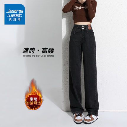 NG真维斯复古直筒牛仔裤女秋冬新款黑色高腰窄版小个子加绒阔腿裤