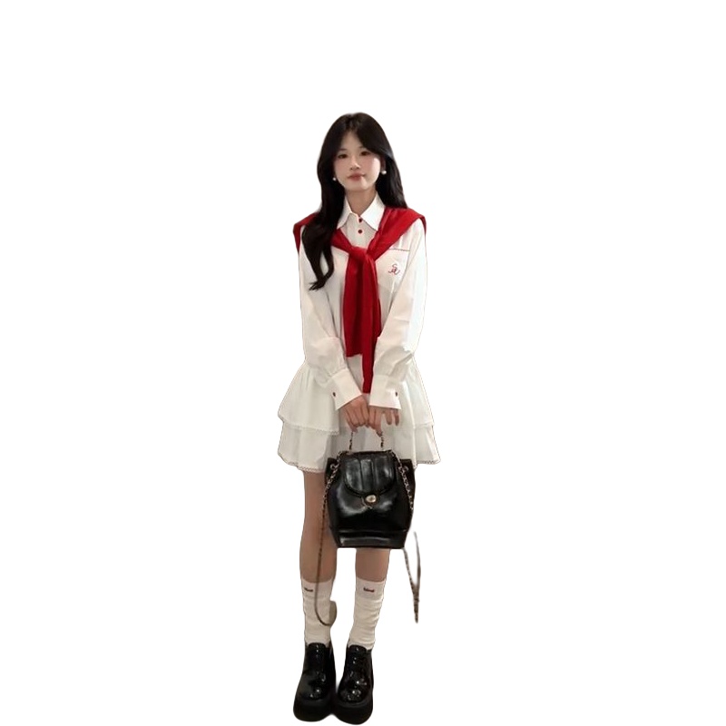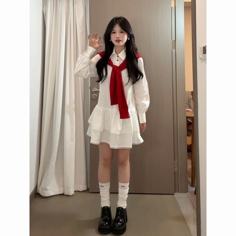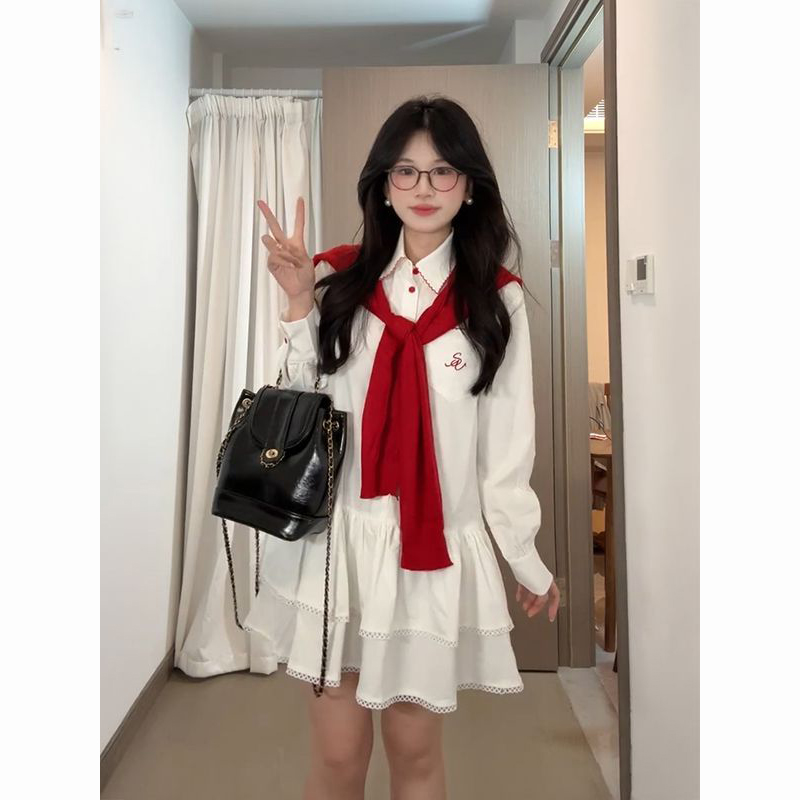 早秋时尚气质学院风红色披肩搭配白色翻领拼接长袖连衣裙两件套装