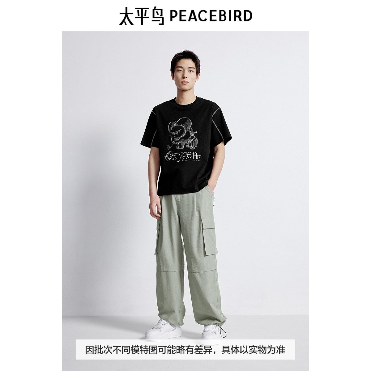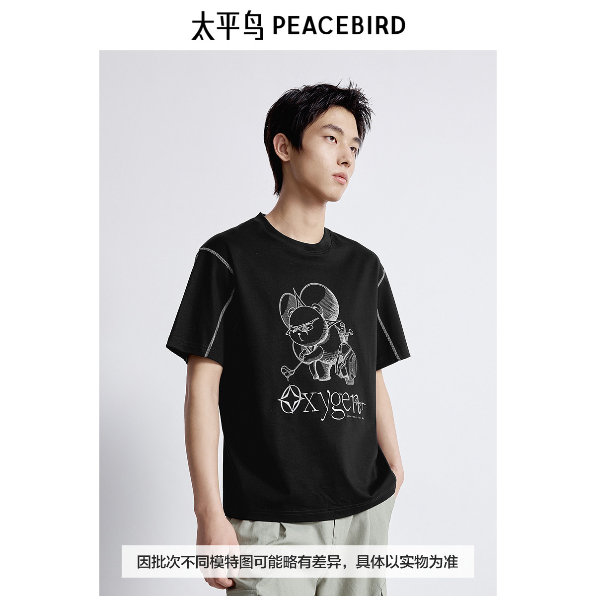 太平鸟男装 潮流撞色刺绣黑色宽松短袖T恤B1CNE2103