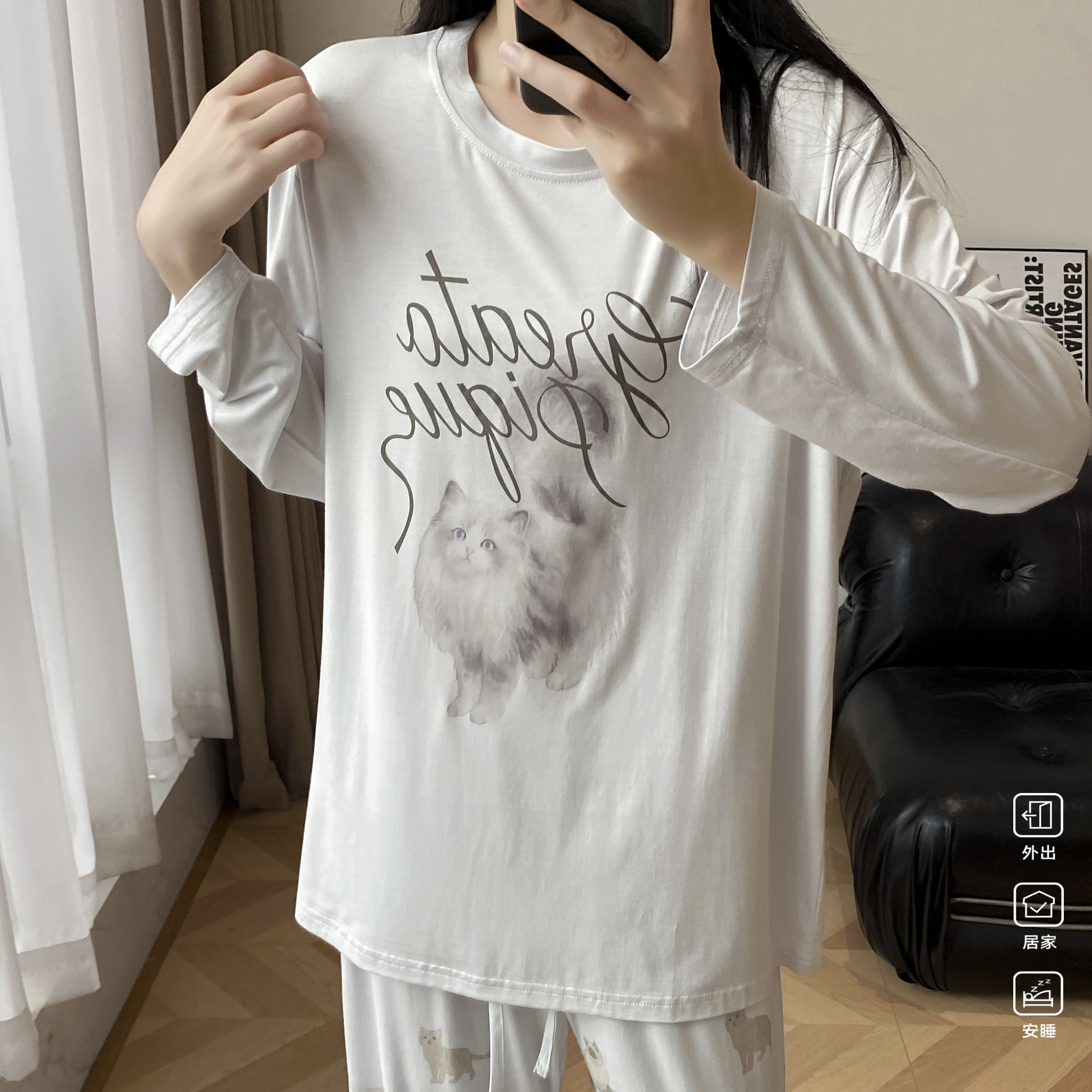 莫代尔长袖长裤猫咪印花睡衣家居服套装女春秋可外穿宽松休闲简约
