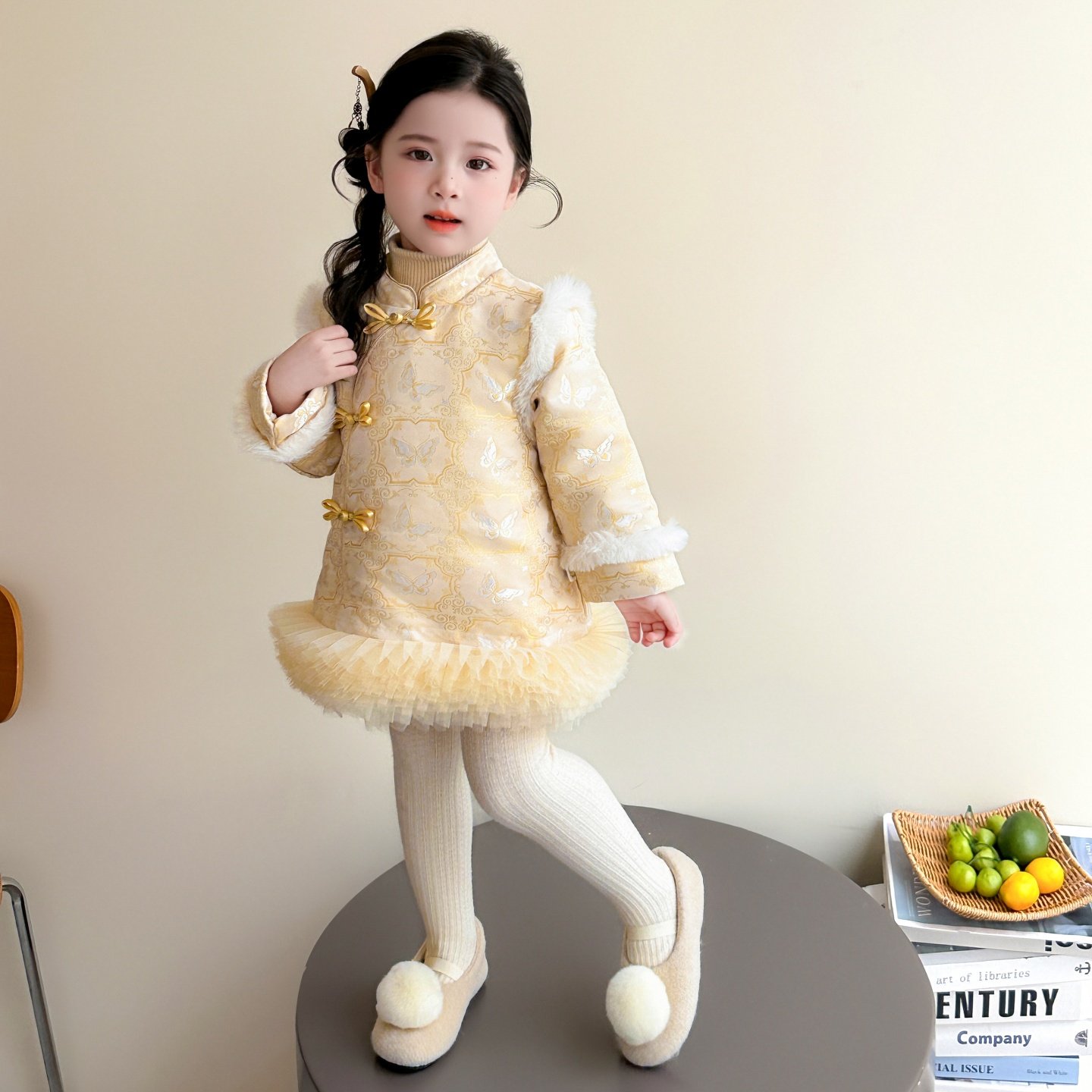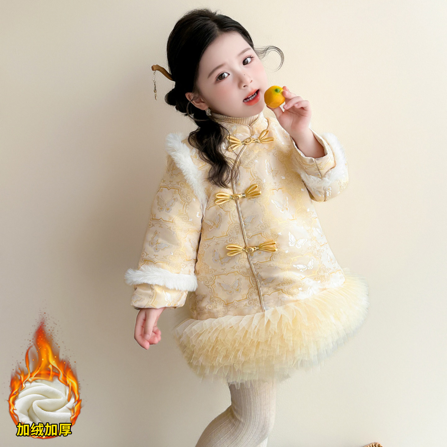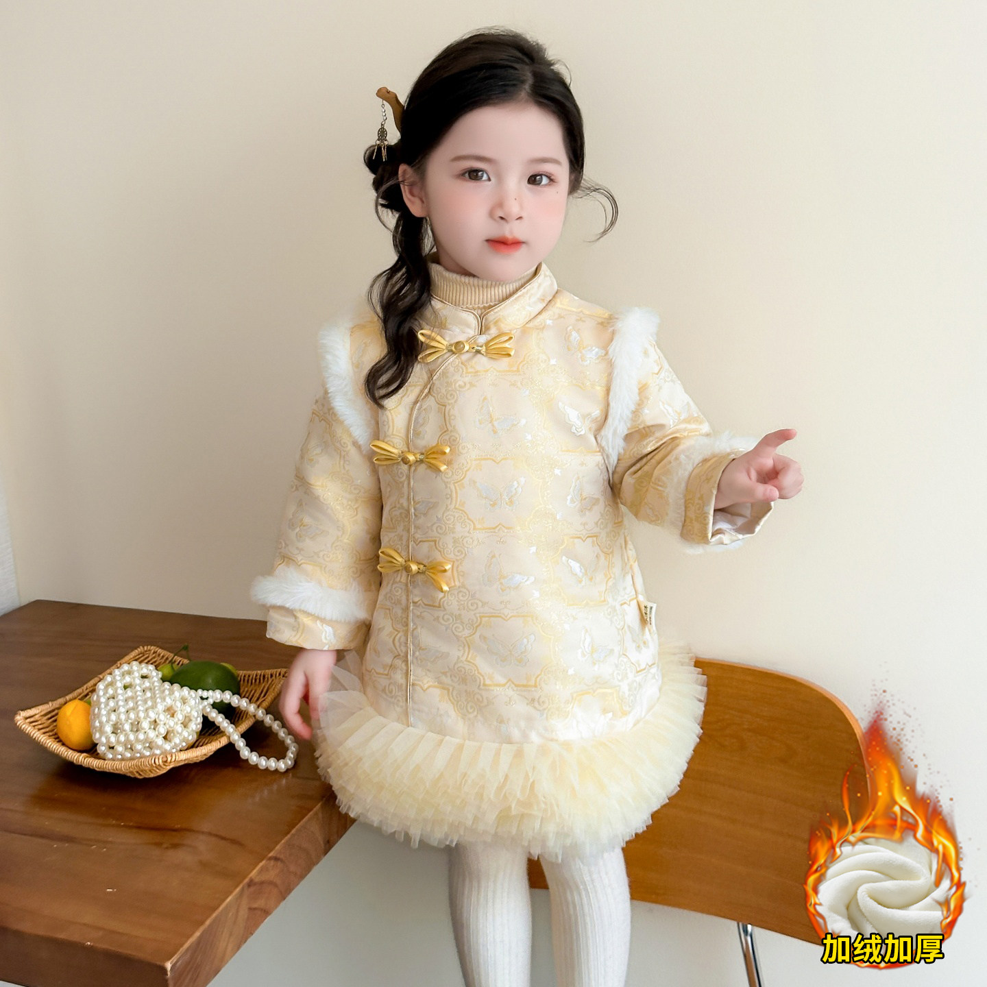 女童古风连衣裙女宝加绒长袖旗袍裙儿童拼接拜年盘扣裙子冬装新年