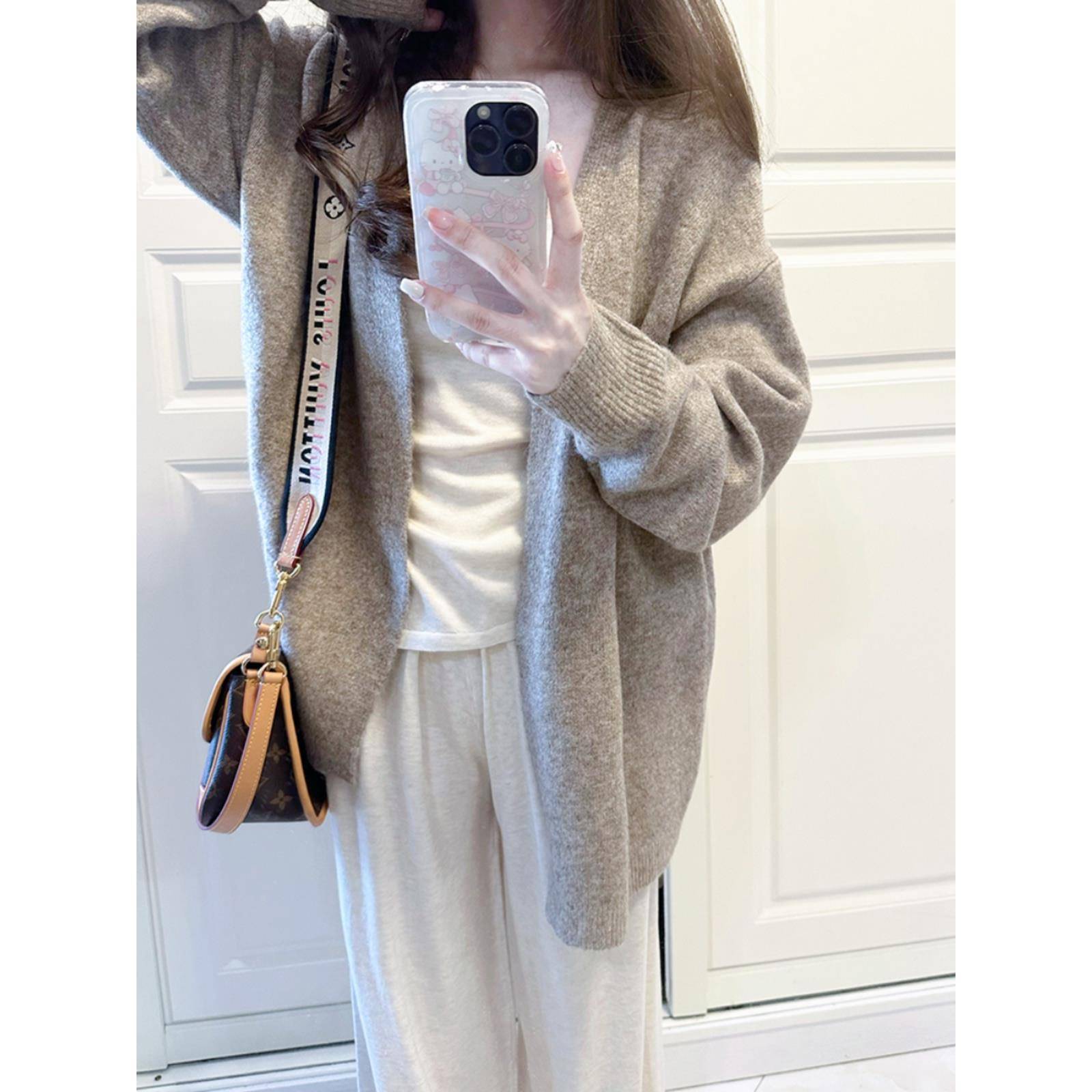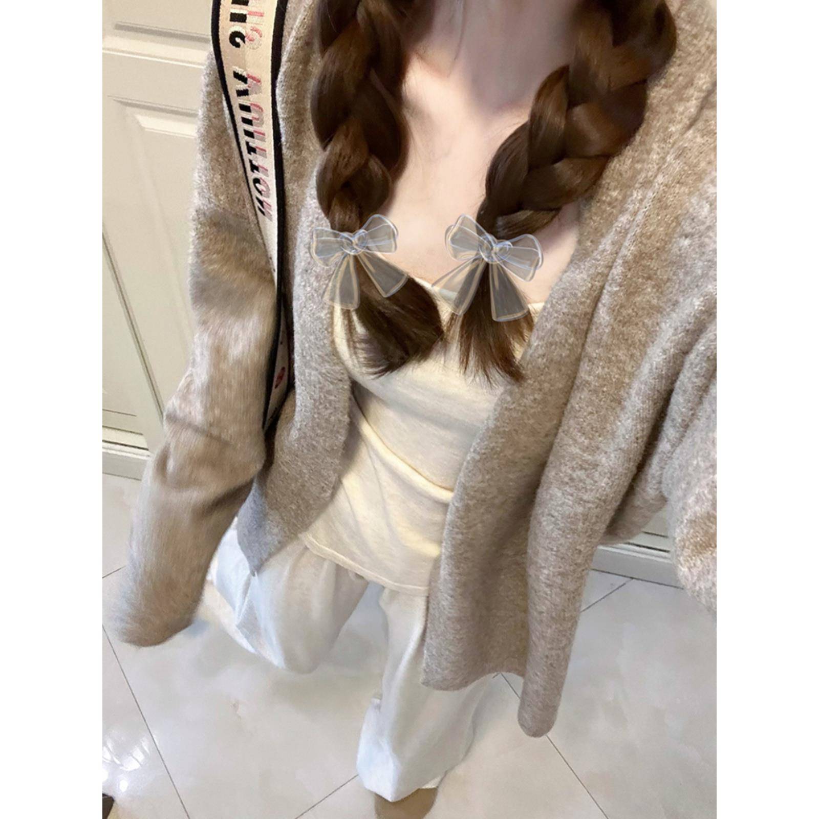 温柔慵懒风~燕麦色针织开衫女2025早秋宽松中长款披肩外套加厚