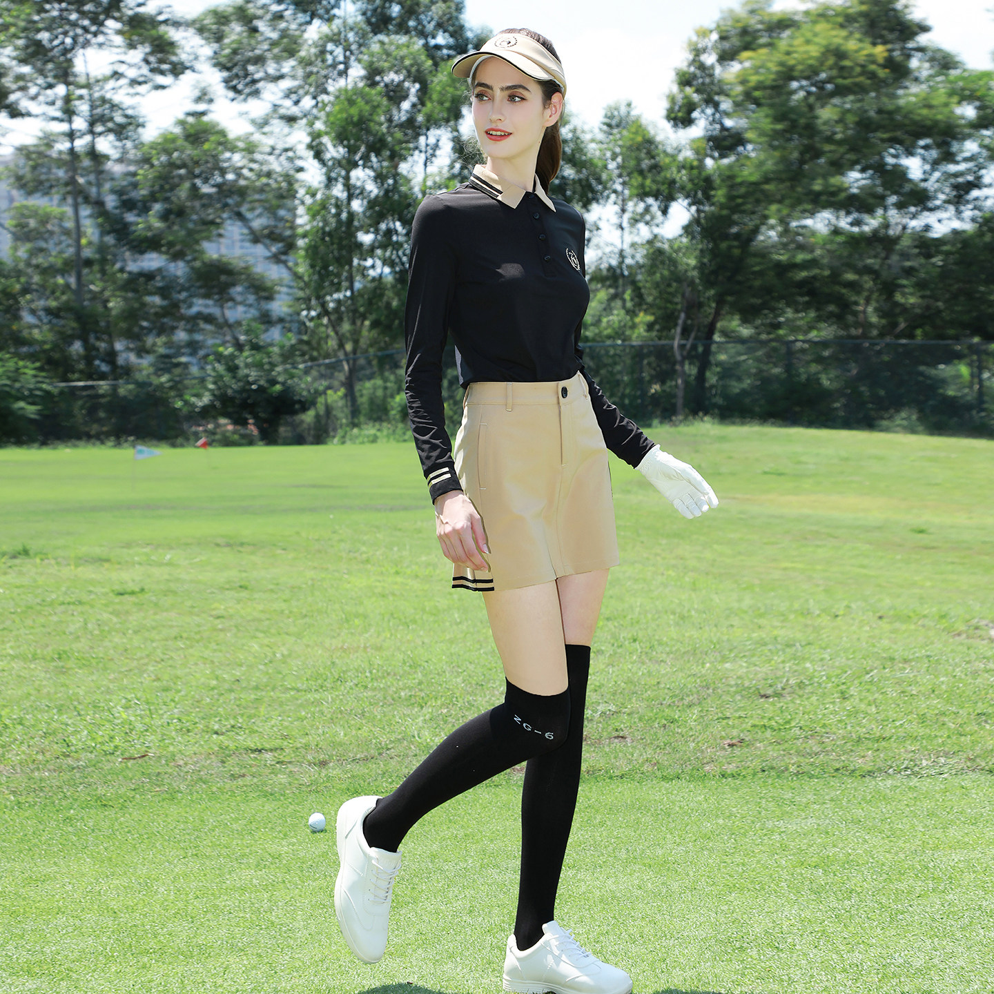 ZG6春秋高尔夫女装球服套装女黑色长袖T恤翻领显瘦上衣网球裙女