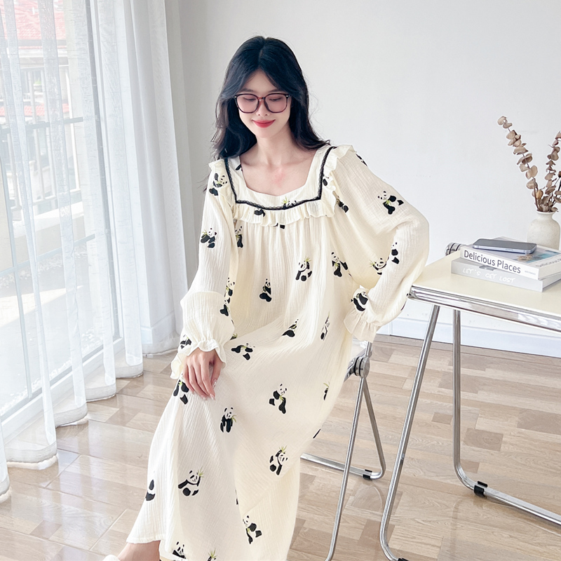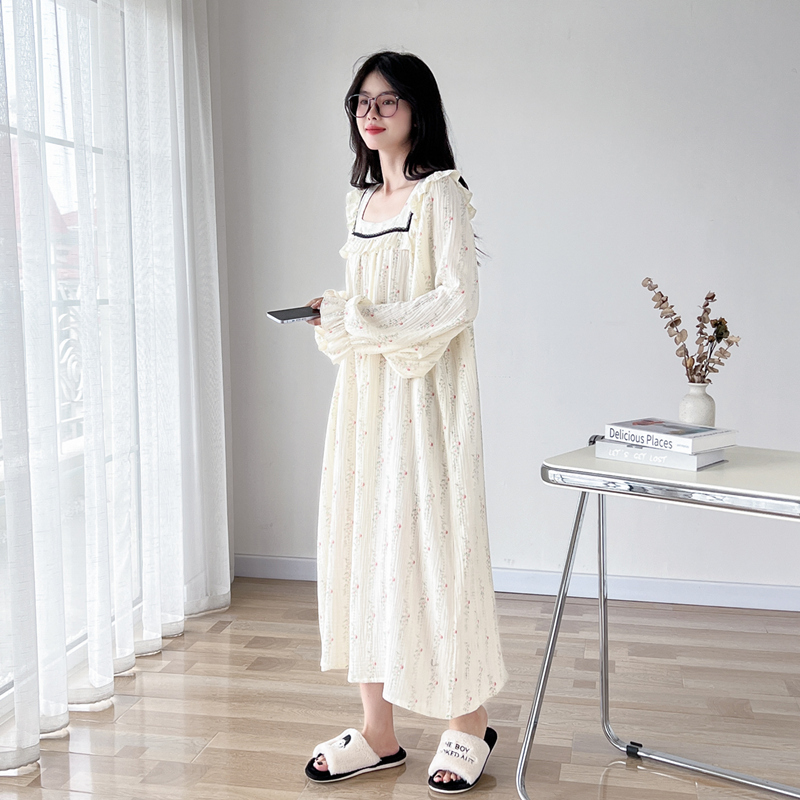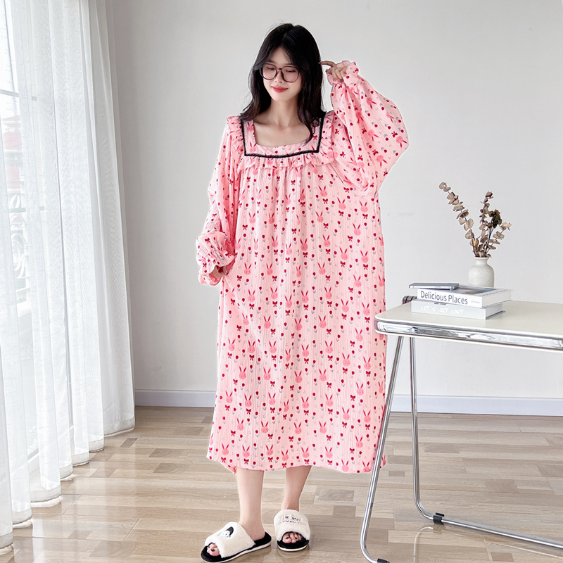 方领公主风大码睡裙女春秋长袖纯棉纱布胖mm200斤孕妇睡衣家居服
