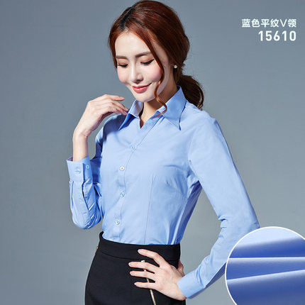 秋季长袖衬衫女职业工装修身V领OL通勤纯蓝色衬衣女打底衫工作服