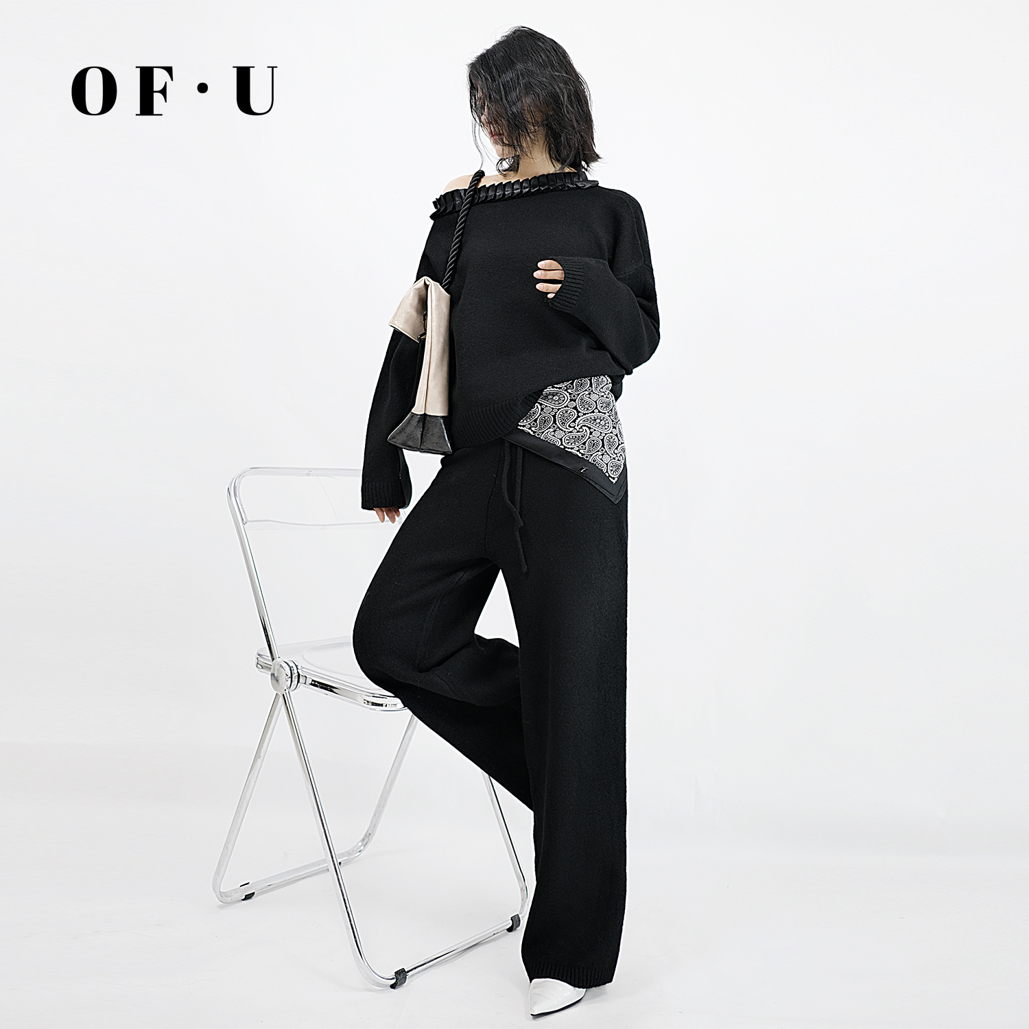 OF U慵懒风套装黑色斜肩毛衣一整套女秋冬宽松针织衫阔腿裤两件套