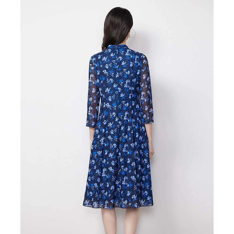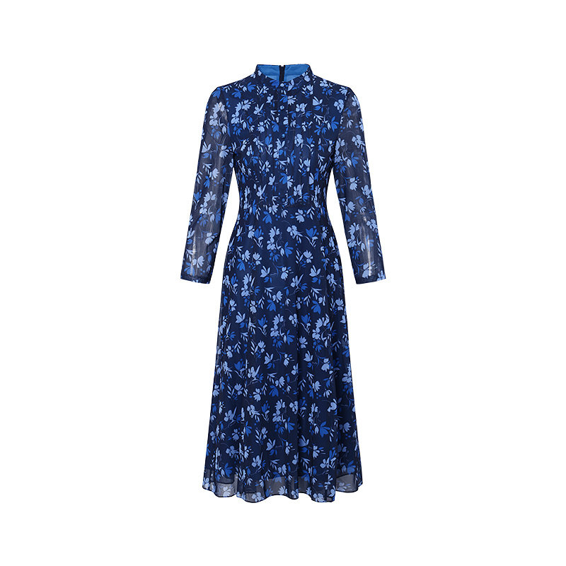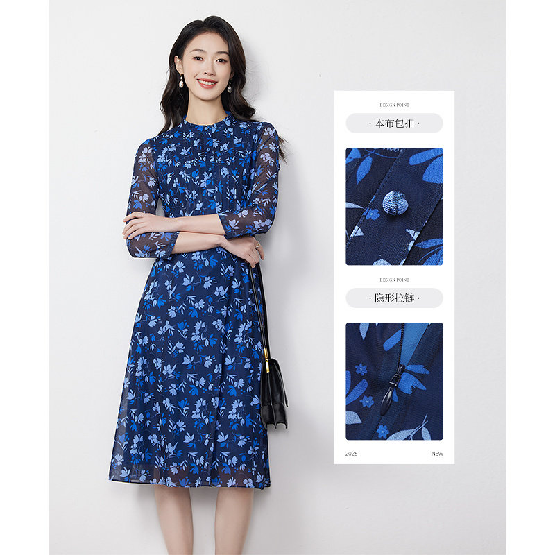 黛玛诗显瘦花裙子2025秋季新款田园风蓝色浪漫网纱印花连衣裙女