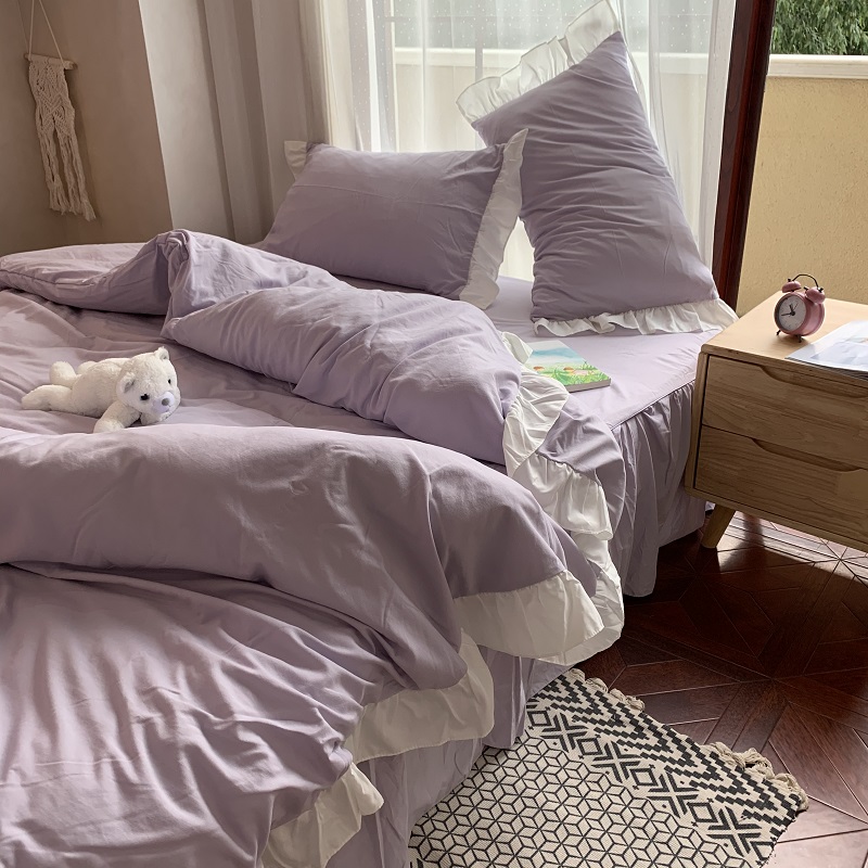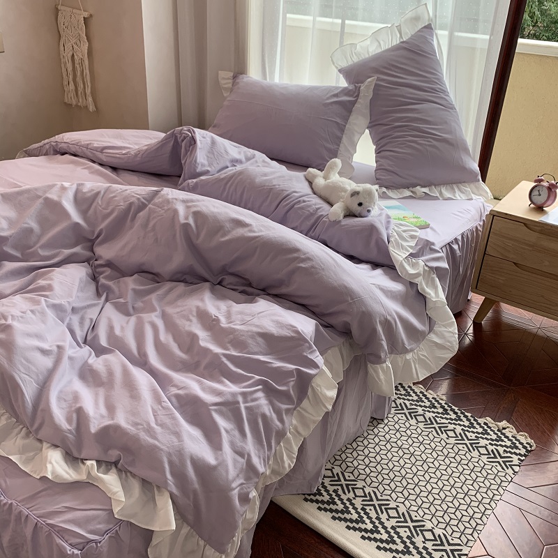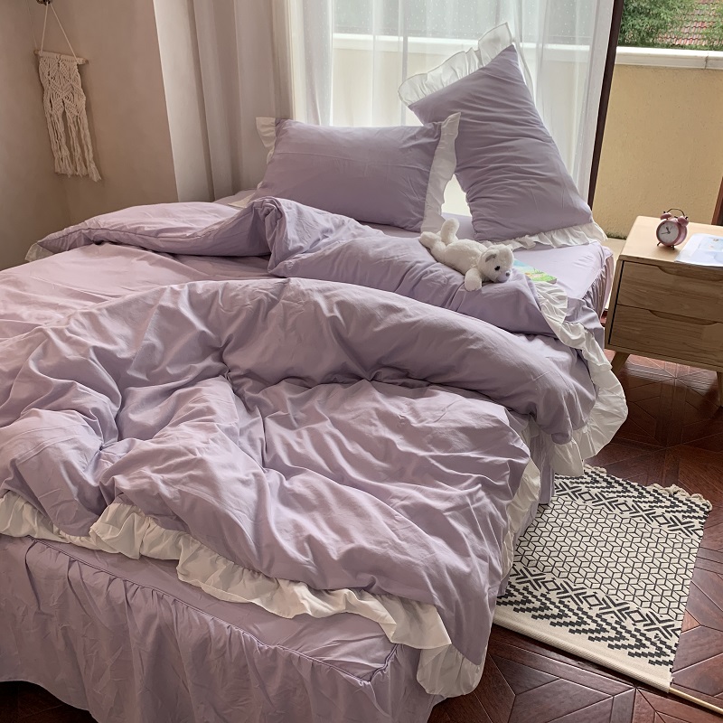荷叶花边四件套浪漫浅紫被套床单床裙纯色单双人床品公主风三件套