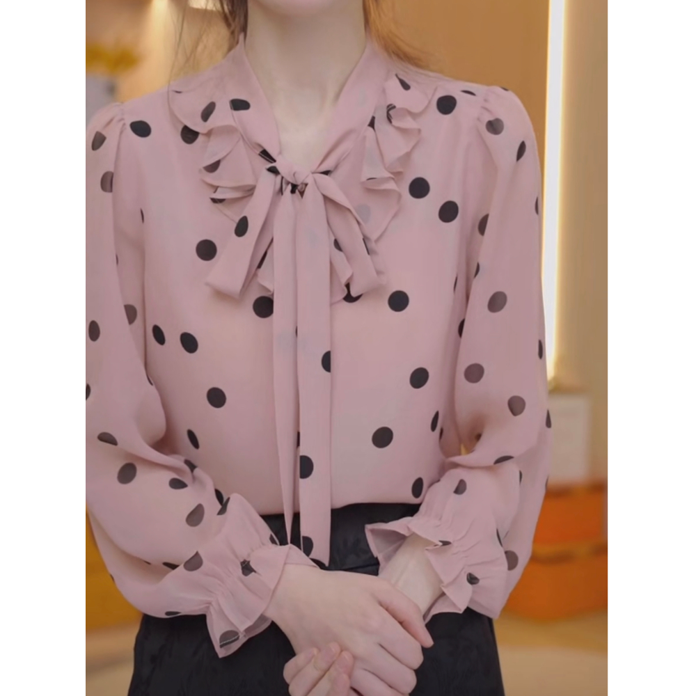 蝴蝶结波点长袖雪纺衬衫女春季新款别致漂亮小衫宽松洋气减龄上衣