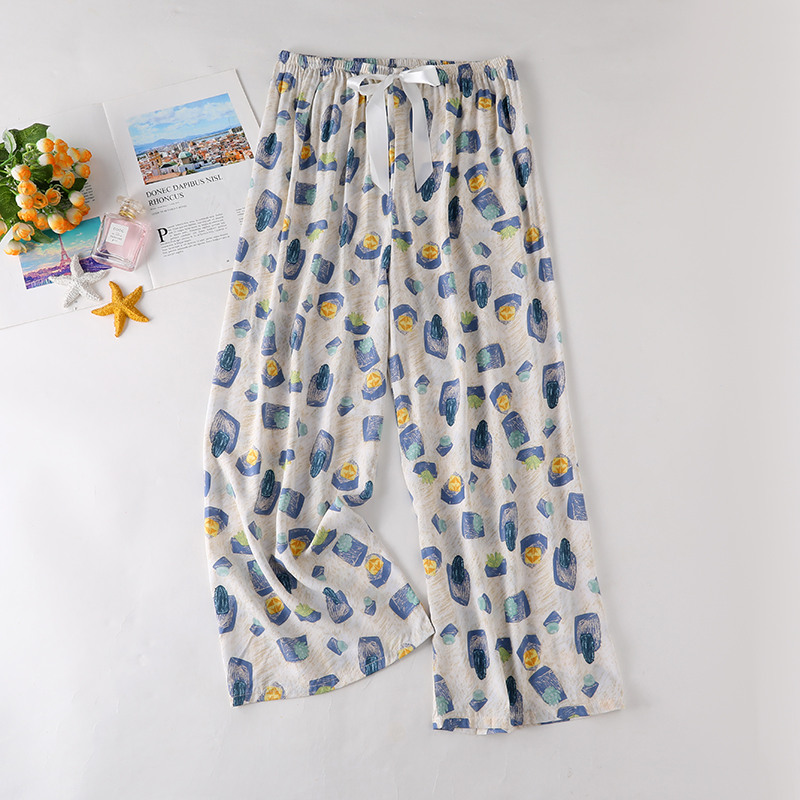 春夏女士睡裤绵绸九分阔腿裤宽松大版家居空调裤薄款甜美印可外穿