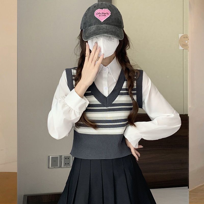 新款韩版气质别致马甲衬衣秋季学院风青春龄假两件针织衫上衣女