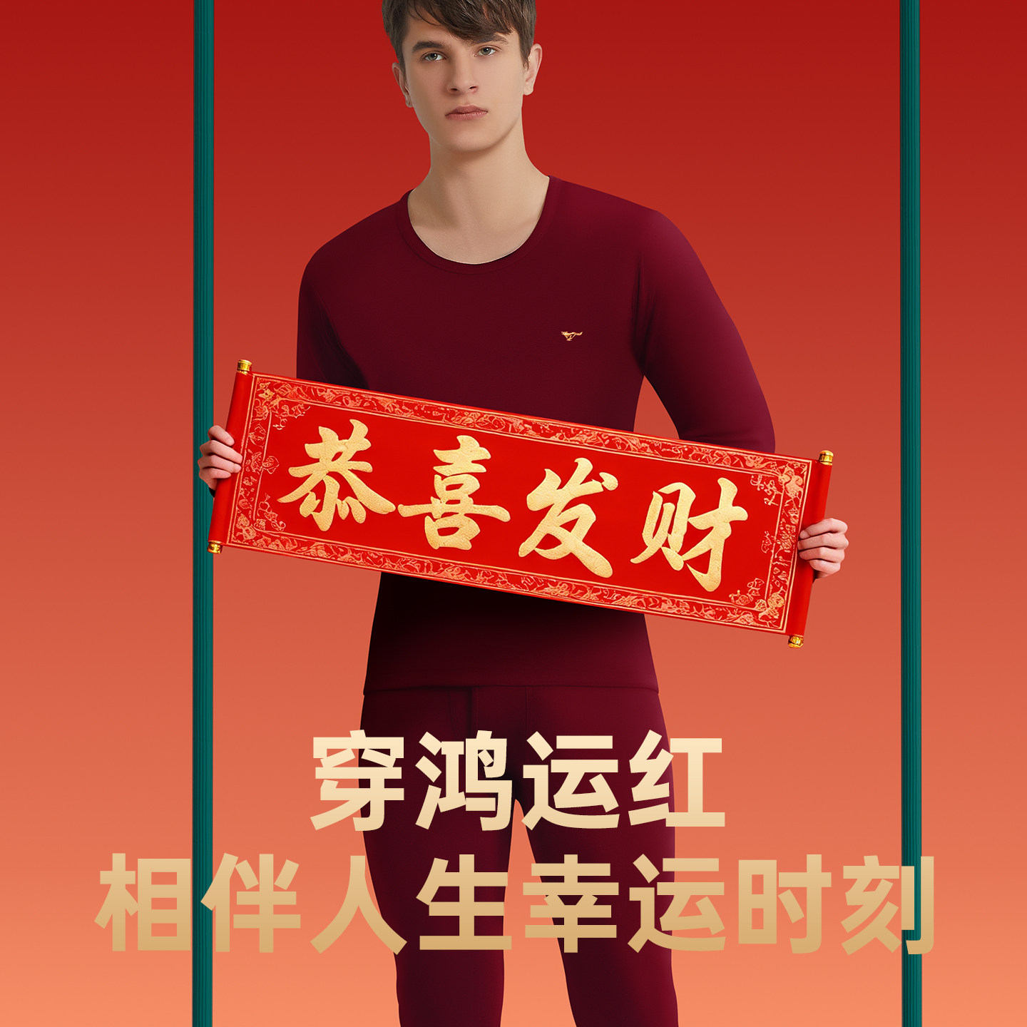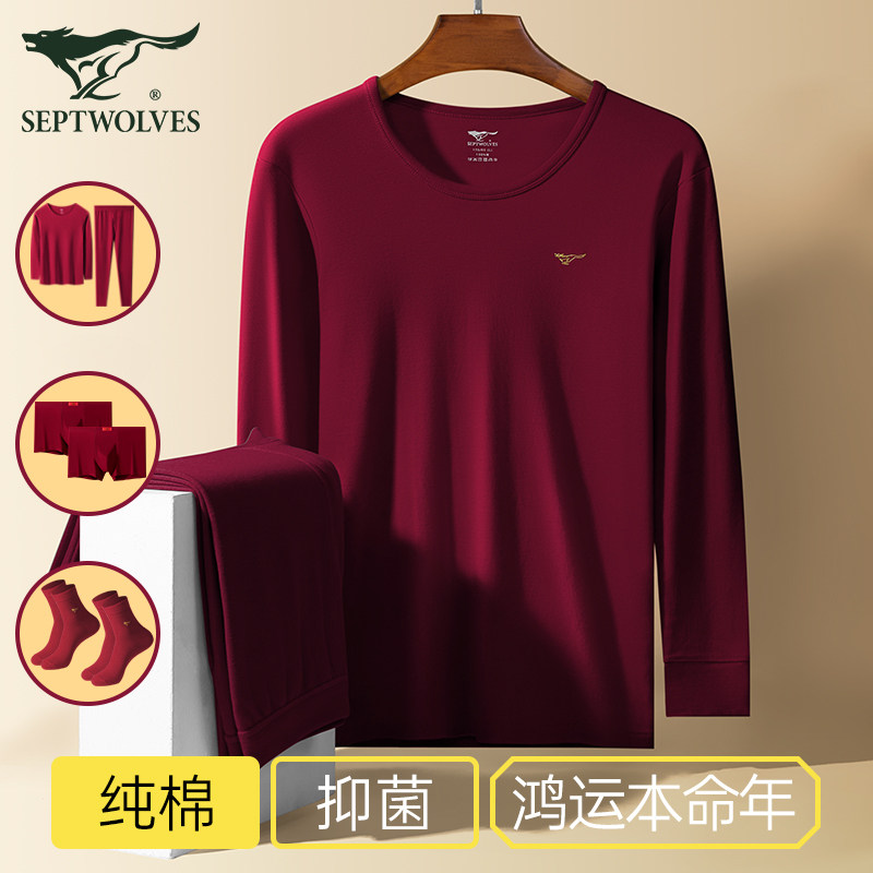 七匹狼中老年爸爸保暖内衣本命年酒红色男士纯棉秋衣秋裤套装冬季