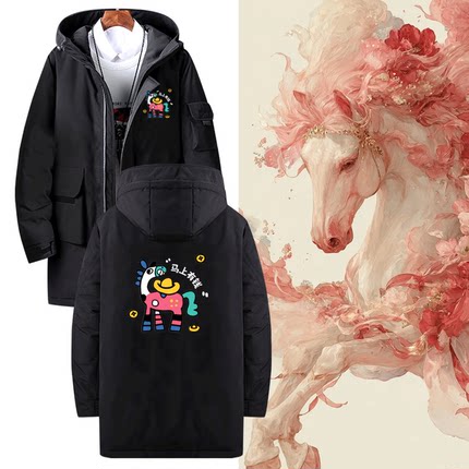 情侣可定制中长款羽绒服2026马年新年马上有钱卡通印花男女秋冬季