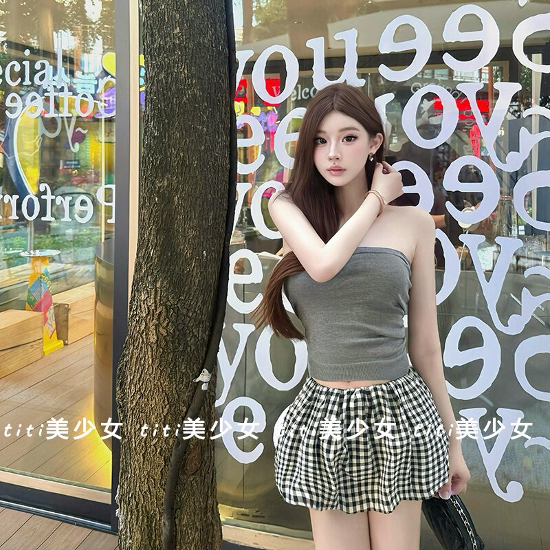 【TiTi美少女】新款韩系辣妹修身针织抹胸背心高腰格纹半身裙套装