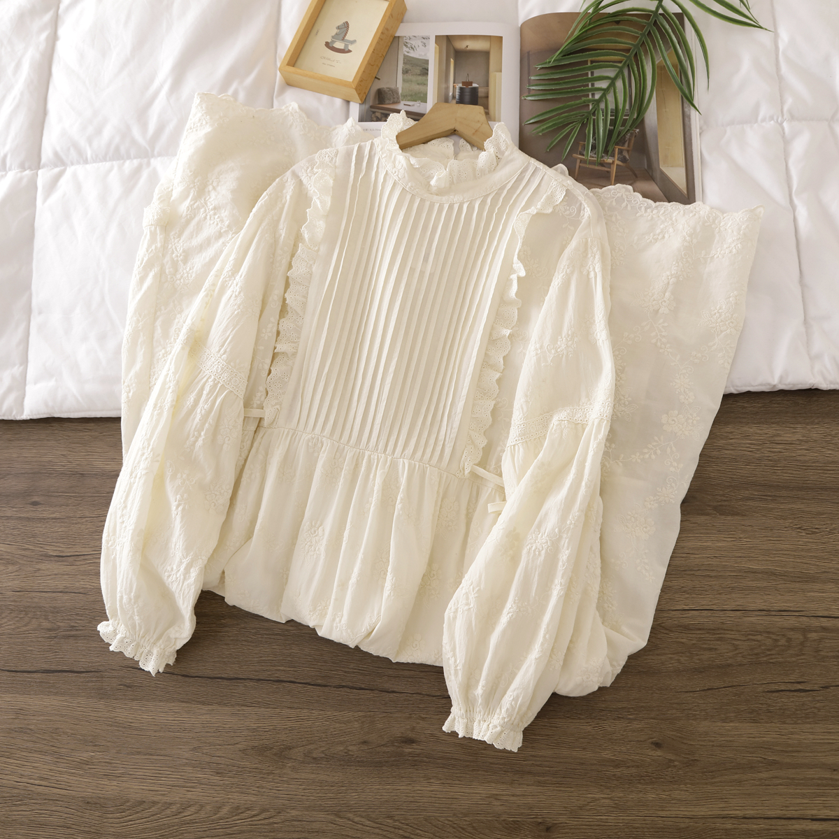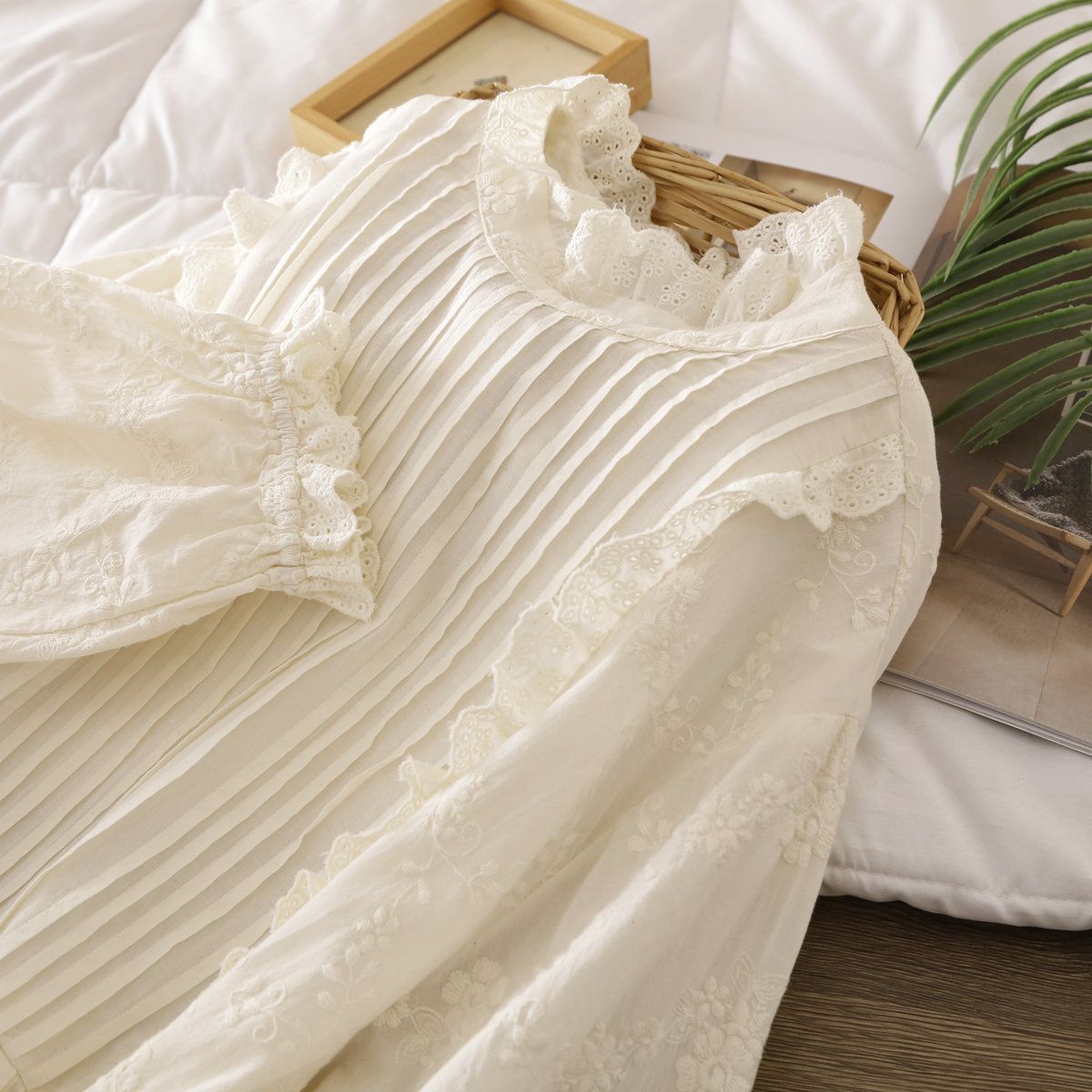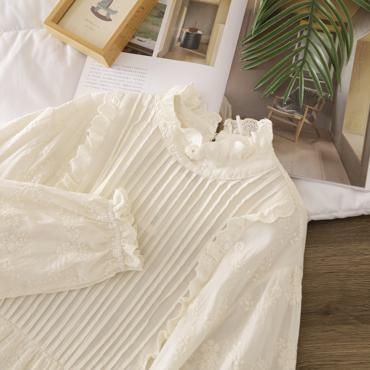 春季女装清新钩花花边立领绣花纯色连衣裙长袖宽松压褶棉麻长裙新